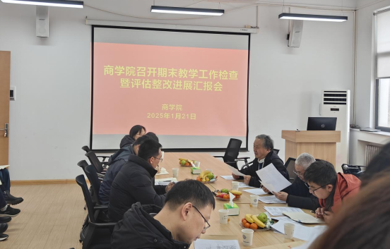 1月21日,商学院在教学楼2号楼315会议室召开期末教学工作检查暨评估整改进展汇报会。商学院院长白朋飞、党委书记郭峰、教学秘书马巧丽、行政秘书郗艳花及各教研室主任参加了此次活动。检查单位由评估组与马克思主义学院组成,对商学院的评估整改进度、教学资料、考试资料以及期末总结资料进行了全面细致的检查。旨在加强教学管理和质量控制,提升教学质量。