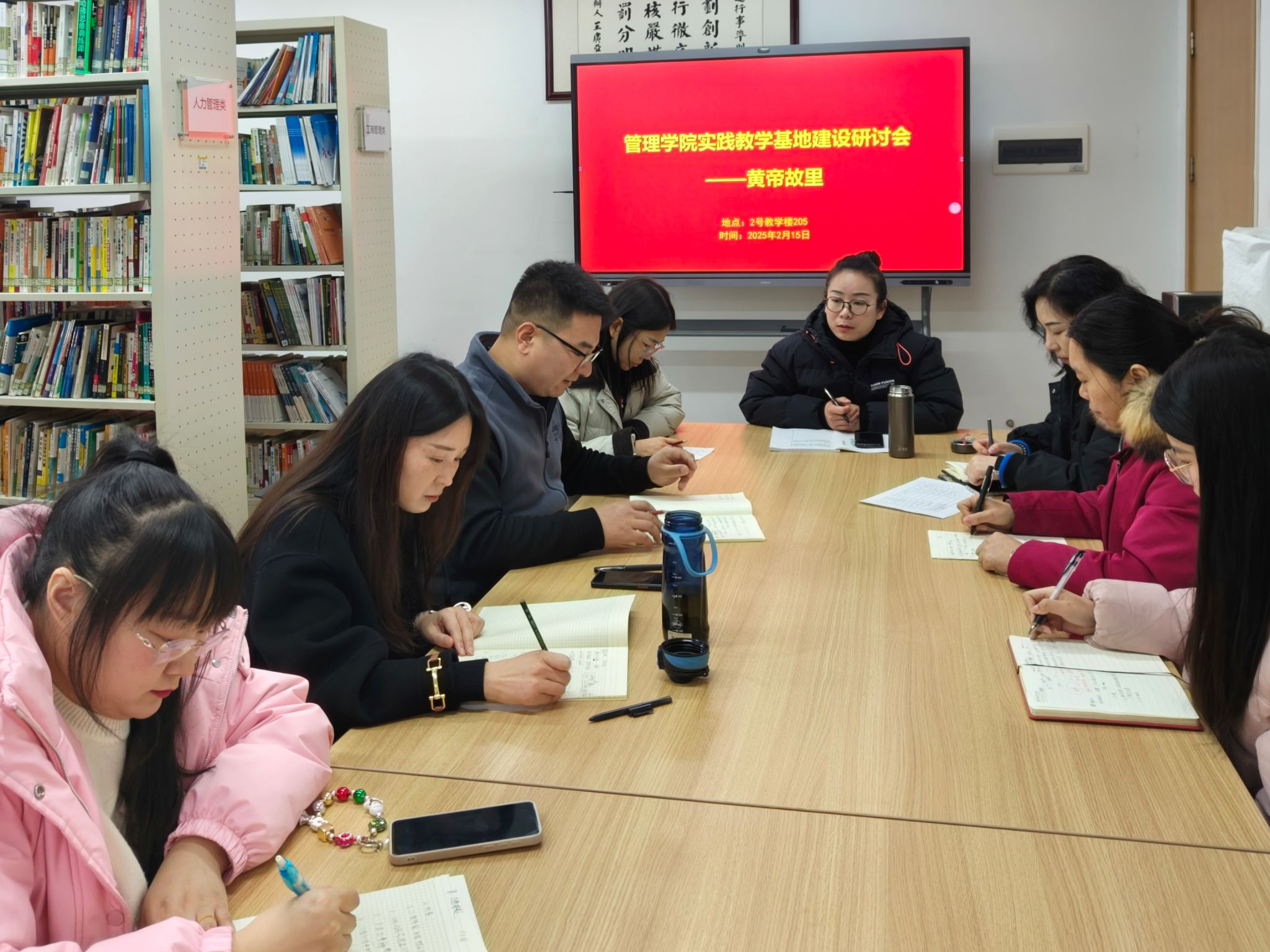 为打造具有文化特色与育人实效的实践教学平台,推动黄帝故里景区实践教学基地产教研深度融合。管理学院于2025年2月15日在2号教学楼205召开黄帝故里景区实践教学基地建设专题研讨会。会议由管理学院院长朱影影主持,参会人员有学院实习实践教学负责人、旅游管理教师代表,参会老师围绕实习实践基地功能深化、校企协同育人模式创新、文创产品开发等议题展开深入讨论。