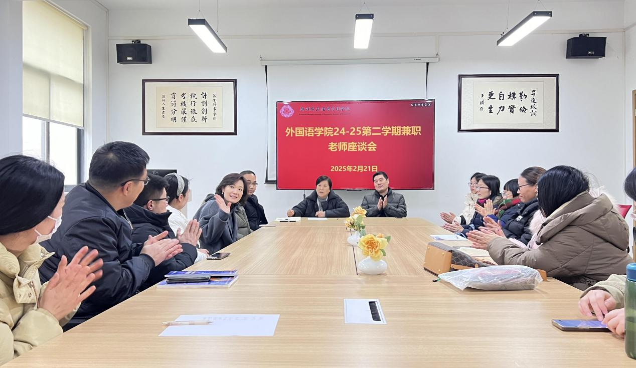 2月21日,外国语学院在学院会议室成功召开2024-2025学年第二学期兼职教师座谈会。会议由学院院长王莉莉教授主持,学院党委书记石皓召、各教研室主任、教学秘书祁胜利老师及全体新聘兼职教师共同参会。本次座谈会旨在加强学院与兼职教师的沟通协作,明确新学期教学目标,优化教学管理机制,共同推进教育教学质量提升。