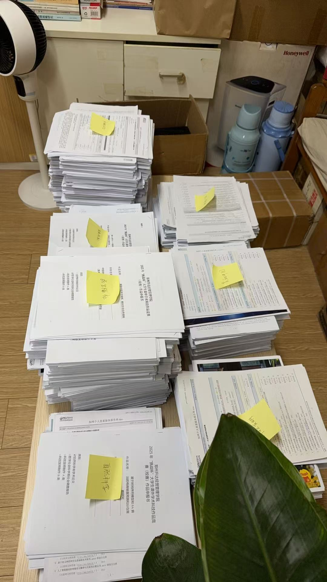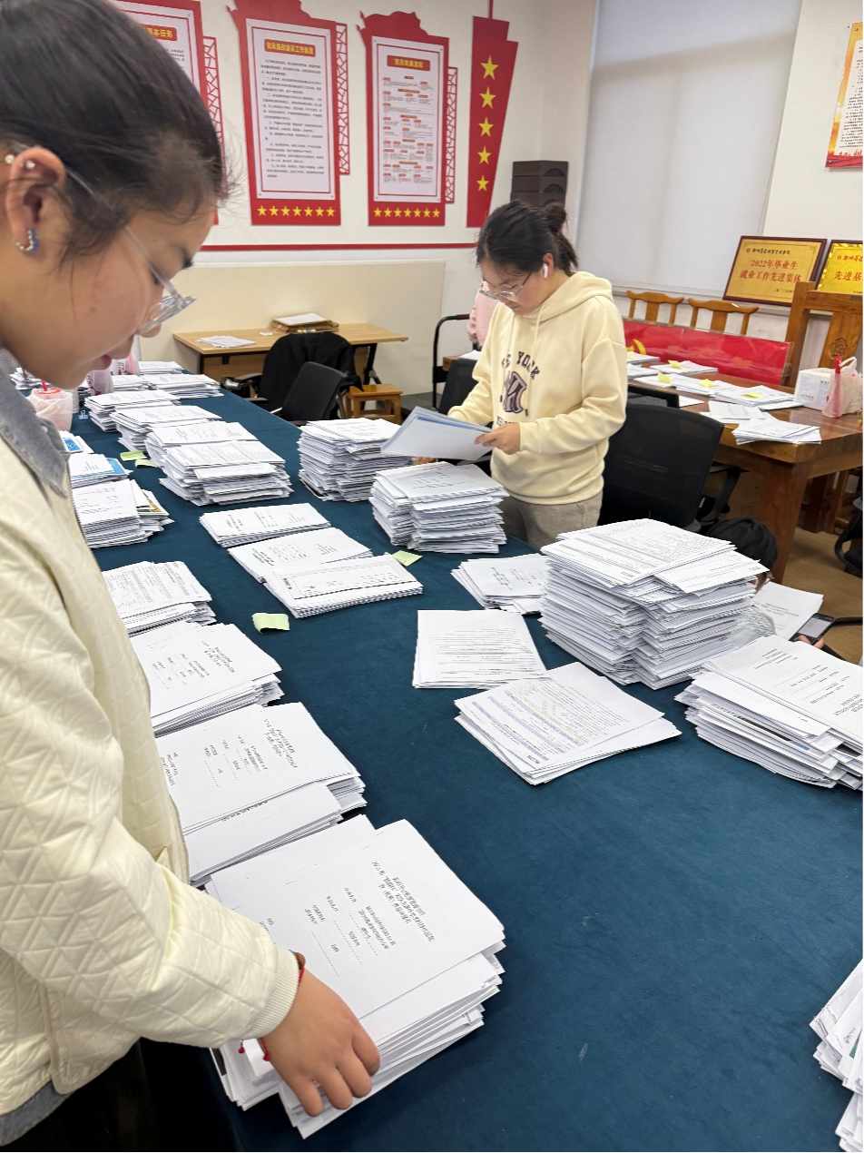 在为期三天的活动中,志愿者们面临着繁重的工作任务。大量的参赛材料堆积如山,但大家毫无怨言,认真细致地对每一份材料进行分类、整理和初步评审。每一摞材料上都贴上了便签,标注着关键信息,以便后续的查阅和处理。充分体现学院对学生科技竞赛和服务保障工作的大力支持。