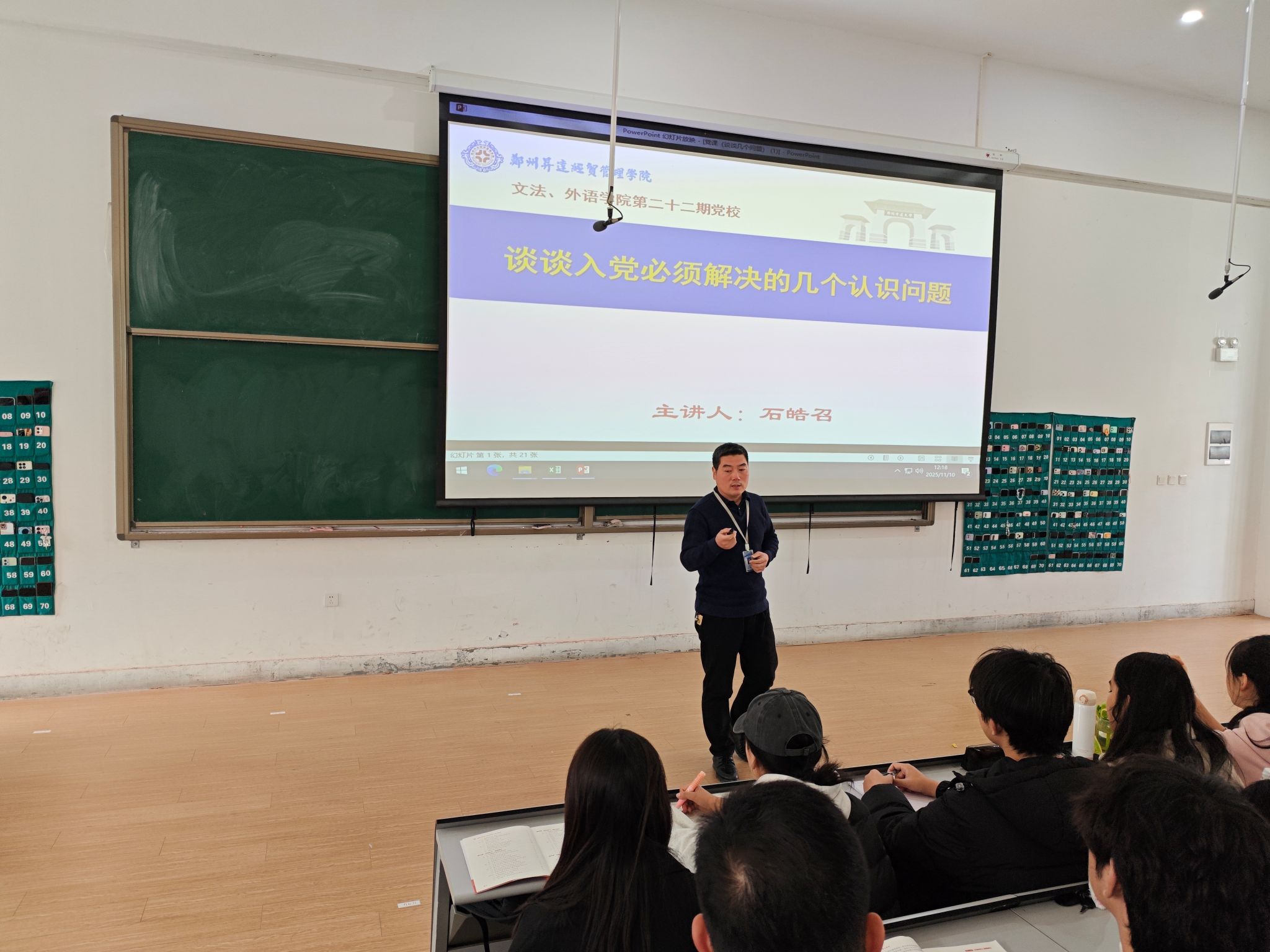 2025年11月10日,外国语学院党委书记石皓召在教学一号楼118教室,为第二十二期业余党校学员讲授题为《谈谈入党必须解决的几个认识问题》的专题党课。