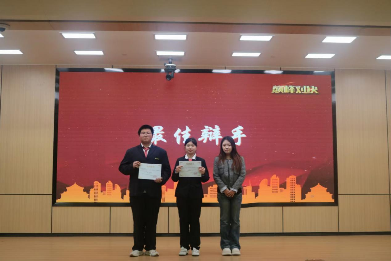 本次比赛进入尾声,获得优秀团体奖的是你说的不对队,获得冠军的是我和评委站一队、获得亚军的是啊对对队、获得季军的是偏要和你作队,获得最佳辩手奖的是马俊涛同学、何思佳同学。随后,评委为优秀团体和优秀辩手颁奖并合影留念。