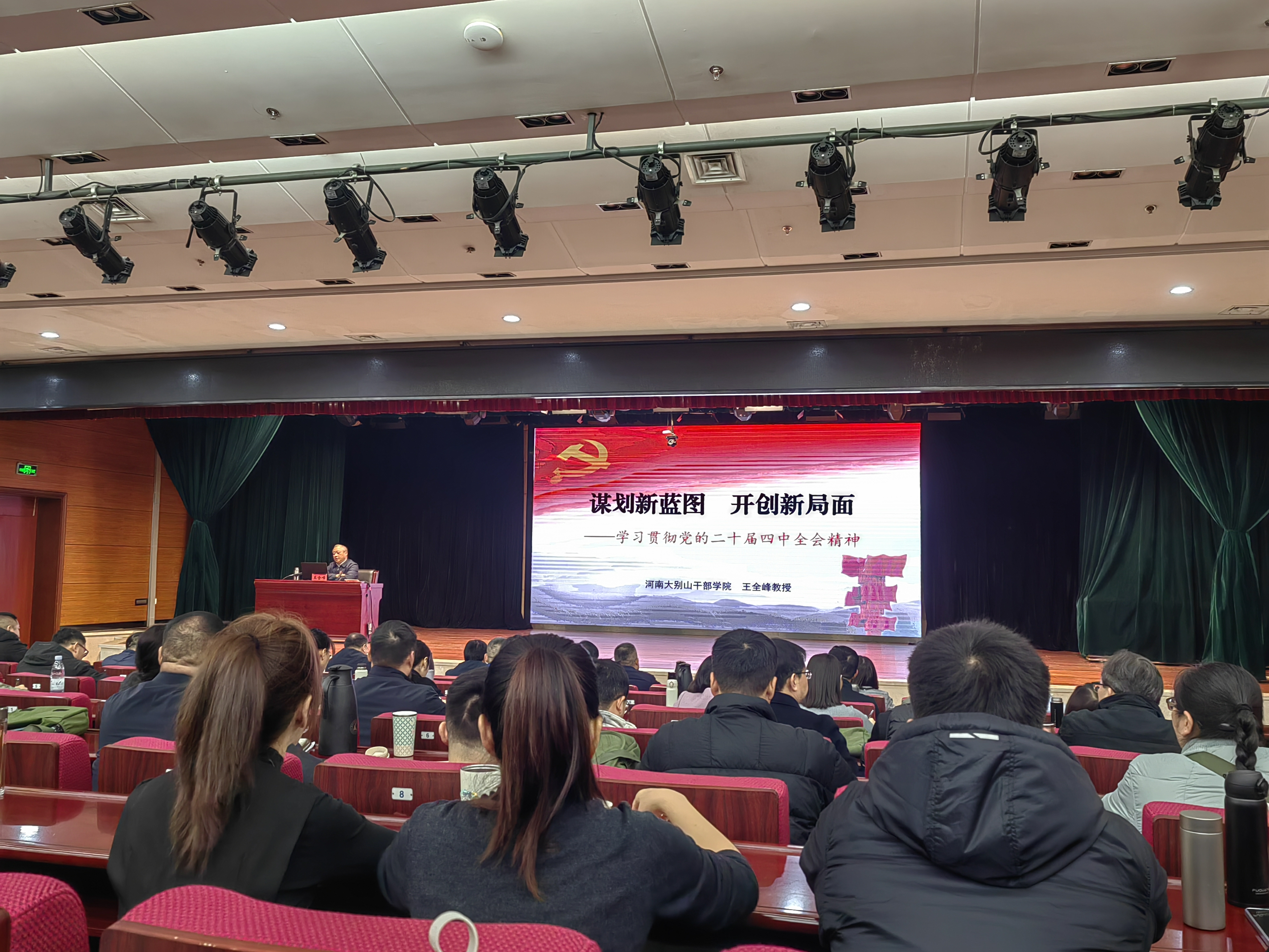在课堂教学环节,大别山干部学院王全峰教授开展主题为《谋划新蓝图 开创新局面——学习贯彻党的二十届四中全会精神》专题授课。王教授围绕习近平总书记在党的二十届四中全会上的重要讲话精神和《中共中央关于制定国民经济和社会发展第十五个五年规划的建议》,深刻阐明了全会的重大意义和深远影响,从“十五五”时期经济社会发展的历史方位、主要目标、战略任务等方面,对党的二十届四中全会精神作了系统阐释,带领大家精准把握大别山精神“坚守信念、胸怀全局、团结奋进、勇当前锋”的核心内涵。
