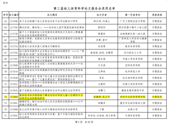近日,由全国青少年体育联合会幼儿体育分会与中国体育科学学会学校体育分会联合主办、四川轻化工大学承办的“第三届幼儿体育科学论文报告会”论文录用结果正式公布。我校体育学院张王利院长、公共体育教研室祖瀚卿教师的学术论文成功入选。