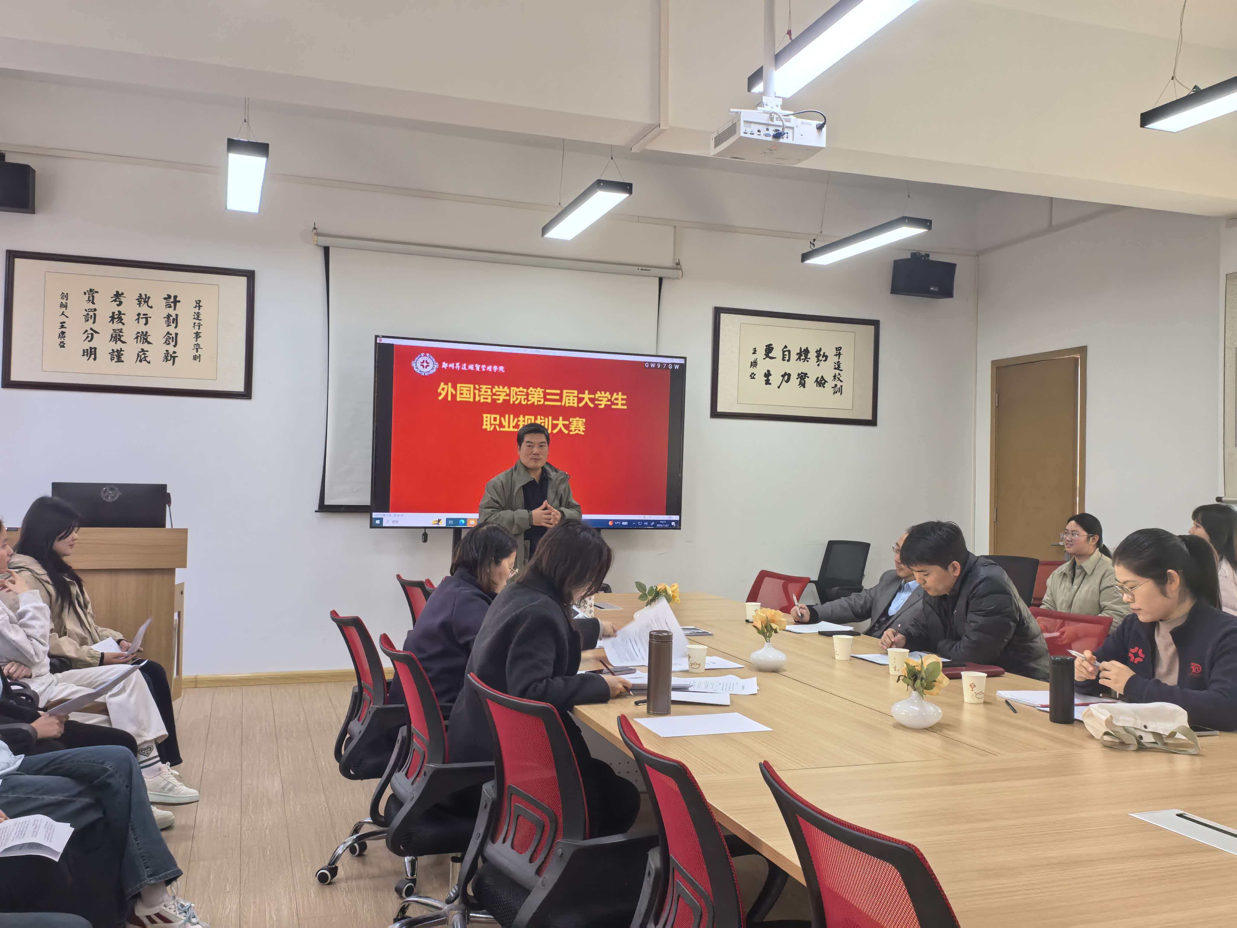 11月27日,外国语学院第三届大学生职业规划大赛在教一楼207会议室成功举办。本次大赛设“成长赛道”与“就业赛道”两大组别,14名选手(成长赛道6名、就业赛道8名)围绕职业目标定位、能力匹配路径等内容展开角逐,学院特邀郑州新东方前途出国就业中心总监史苗笛、大学生创业基础与就业指导教师赵志海,以及翻译教研室袁航、商英教研室王婷婷、日语教研室马林娜组成专业评委团,全程提供精准指导。
