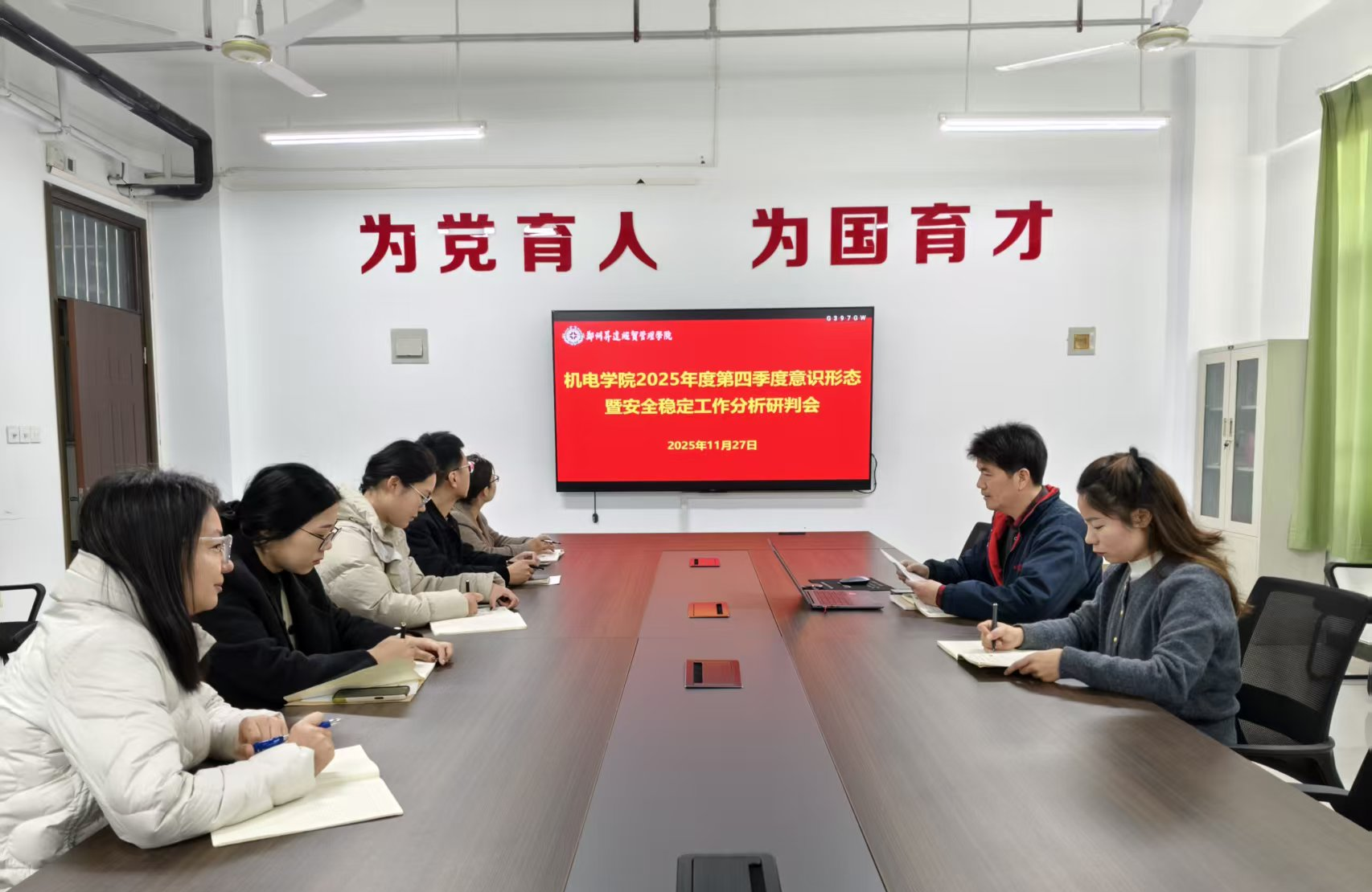 11月27日,机电学院在524会议室召开2025年度第四季度意识形态暨安全稳定工作分析研判会。学院党委委员、党支部书记参加会议。会议由院党委书记丁向育主持。