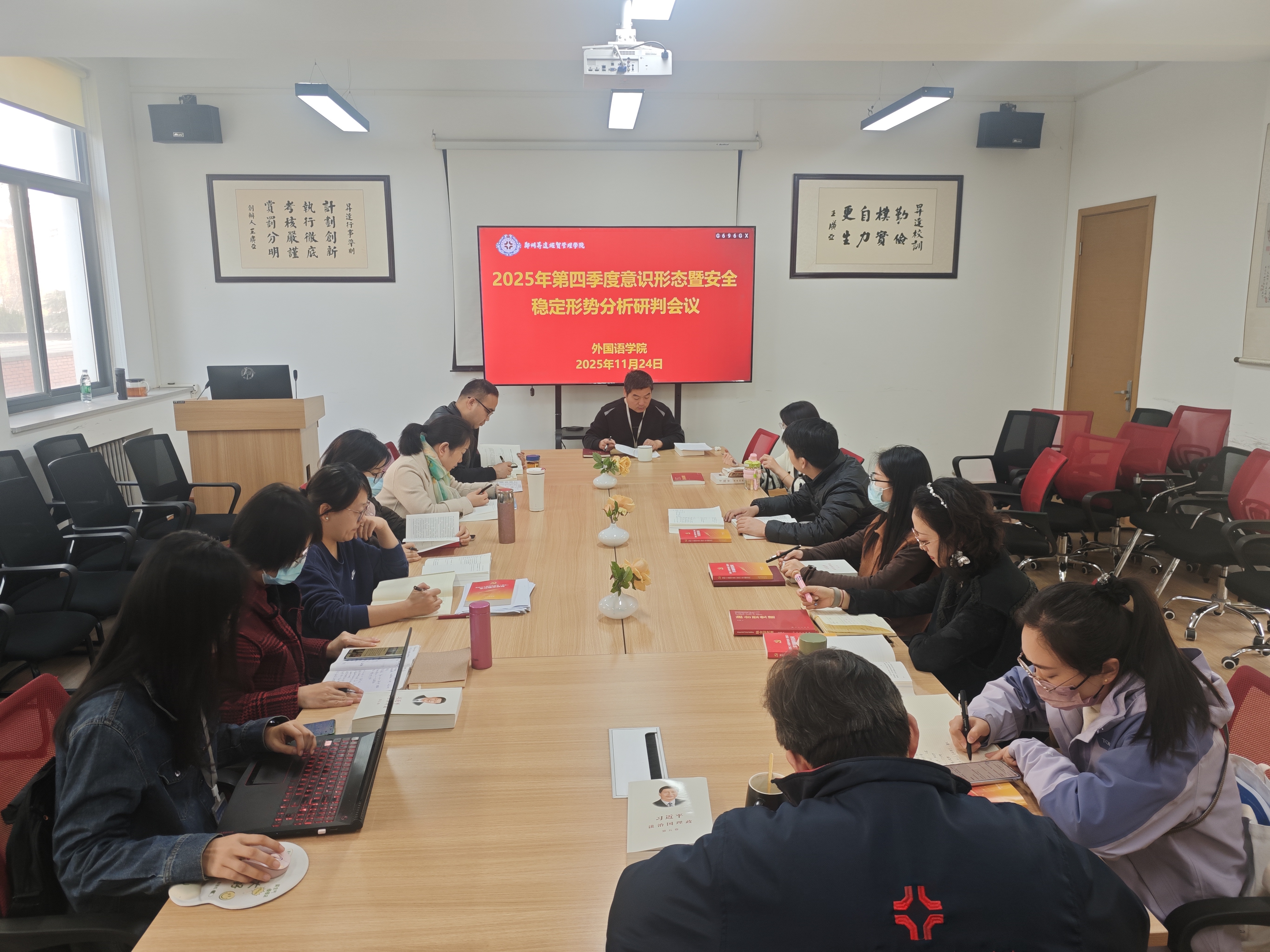 11月24日,外国语学院党委组织召开第四季度意识形态安全暨安全稳定形势分析研判专题会议,聚焦校园安全风险防控与意识形态阵地管理,系统梳理潜在隐患,部署下一阶段重点工作。会议由学院党委书记石皓召主持,全体党委委员、各党支部书记参会。