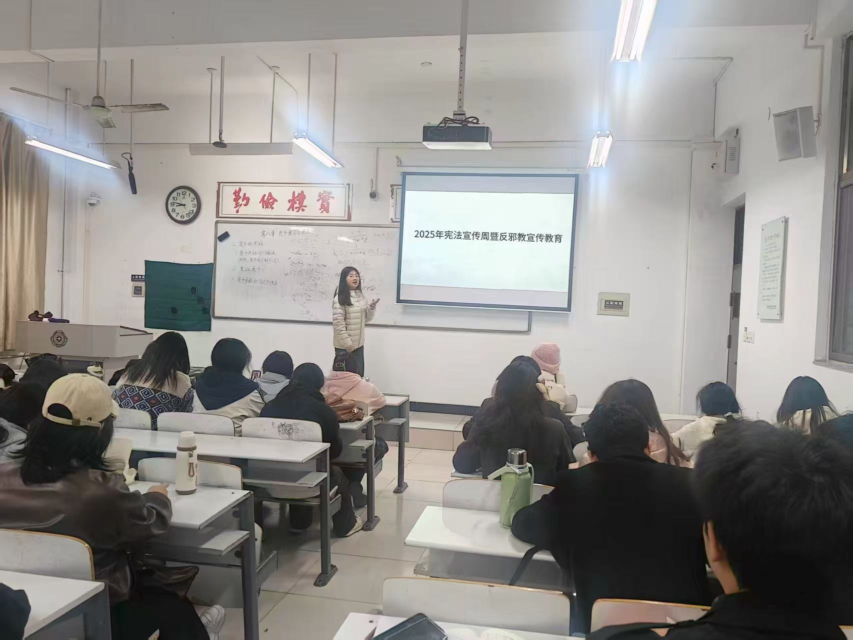 作为系列活动的核心环节,各班级以“学宪法・反邪教・守平安”为主题同步开展班会,实现全院年级、班级全覆盖。反邪教协会骨干成员化身“青年宣讲员”,走进课堂通过 PPT 演示、案例拆解、互动问答等形式,结合邪教组织“精神控制”“编造歪理”“敛财害命”的典型特征,用真实案例揭露邪教对个人、家庭及社会的严重危害。为提升参与感与实效性,同学们在宪法条文、反邪教法规抢答中深化记忆,将法治信仰与反邪决心转化为自觉行动。