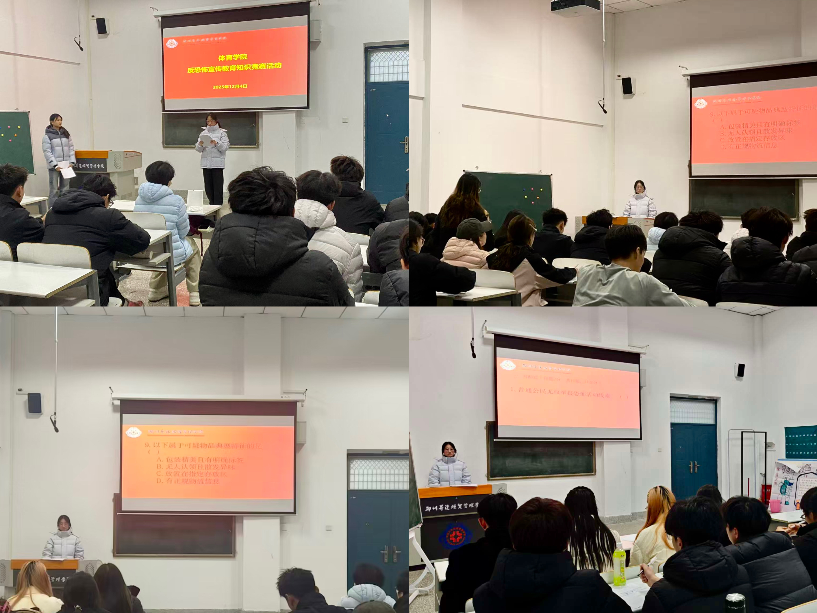 丰富活动类型,增强反恐教育实效。为促使学生积极参与反恐怖宣传教育活动,学院组织开展了反恐怖知识竞赛和反恐标语设计大赛两大特色活动,让反恐安全理念深入人心。反恐怖知识竞赛活动自开展以来,得到了学院师生的积极响应。竞赛内容涵盖《中华人民共和国反恐怖主义法》、应急避险技巧、自救互救常识等多个方面,注重理论知识掌握和实际技能运用结合。同期举办的反恐怖标语设计大赛,面向各年级学生征集作品。此活动得到学生广泛参与,参赛作品紧扣反恐防恐核心主题,体现了学生对反恐教育的理解与创新。