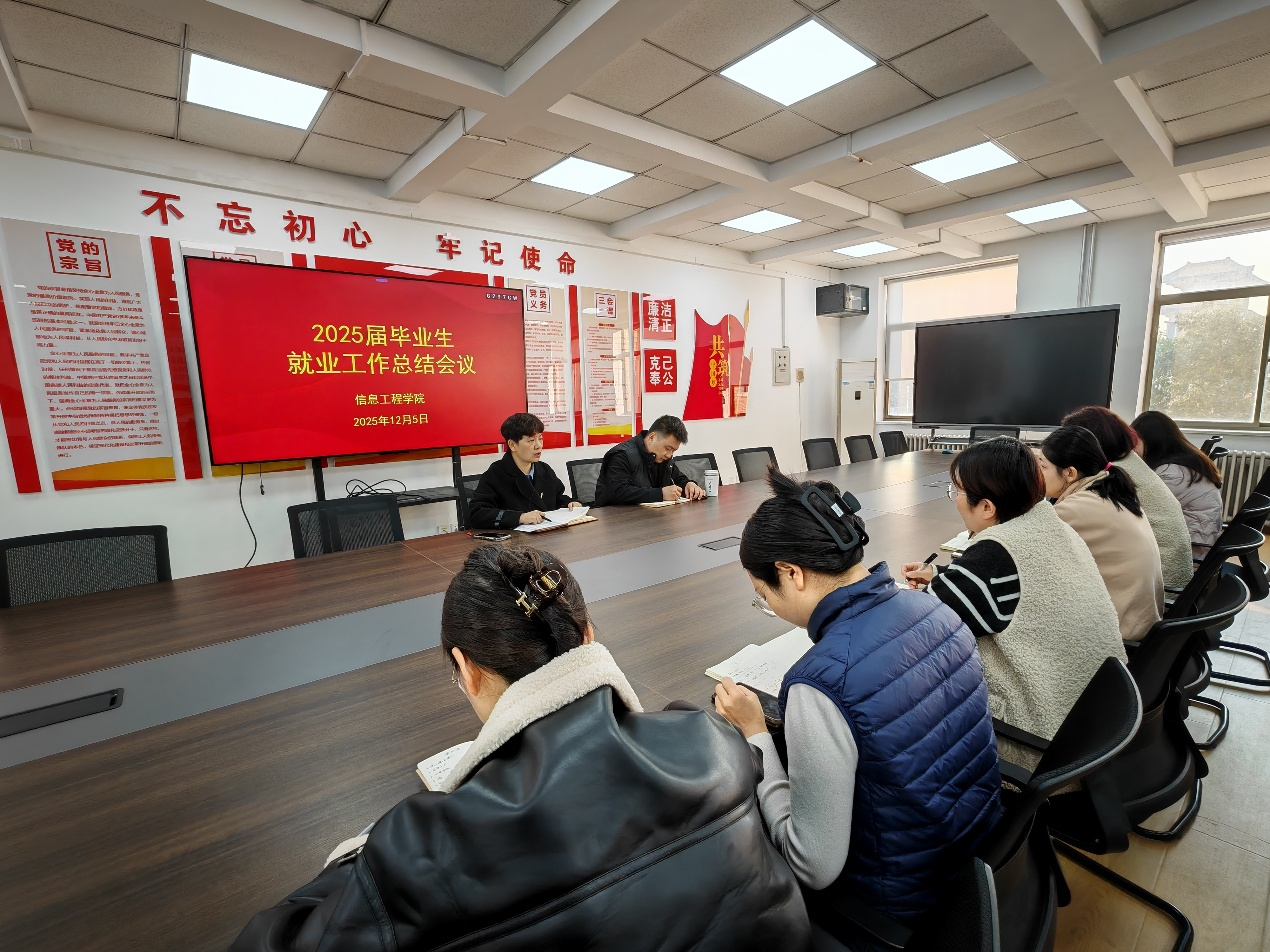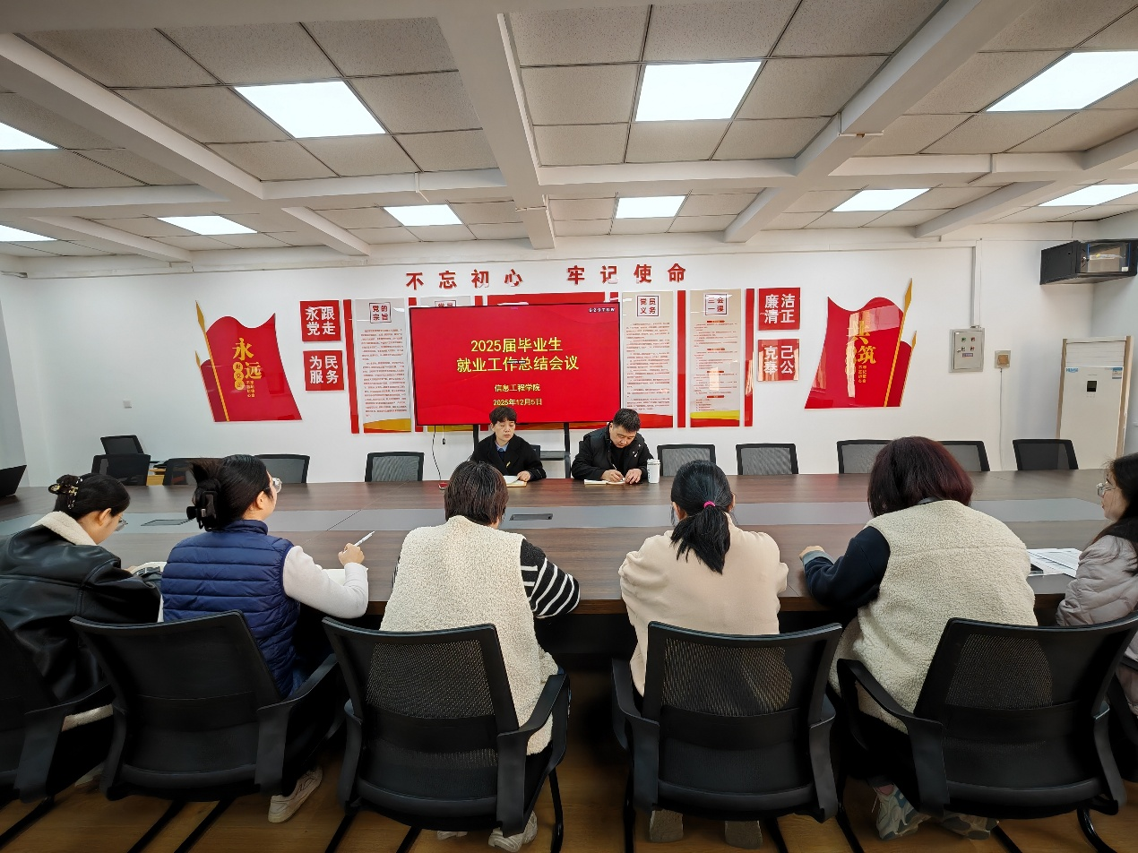 12月5日,信息工程学院2025届毕业生就业工作总结会议在商管楼218会议室召开。学院党委书记钟江鸽、党委副书记王崇,以及全体2025届毕业班辅导员出席会议,系统梳理本届毕业生就业工作成效,研判现存问题,并部署后续工作方向。