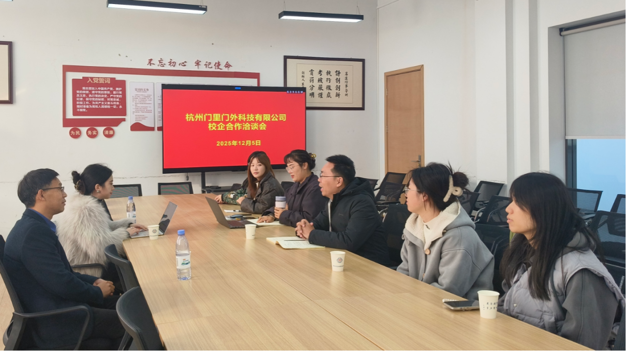 2025年12月5日,商学院与杭州门里门外科技有限公司校企合作洽谈会在教学楼2号楼315会议室成功举行。本次会议以“深化产教融合,共育直播英才”为主题,双方围绕电商领域,特别是直播人才培养的协同创新与实践路径进行了深入且富有成效的交流。杭州门里门外科技有限公司校企合作部负责人许振兴、直播带货主播主管蒋雪玲,商学院院长白朋飞、产学研专员刘玲芳、产业学院教师卢瑞娜及直播教学团队骨干教师魏民、南夏、郭红瑶共同出席了本次洽谈会。