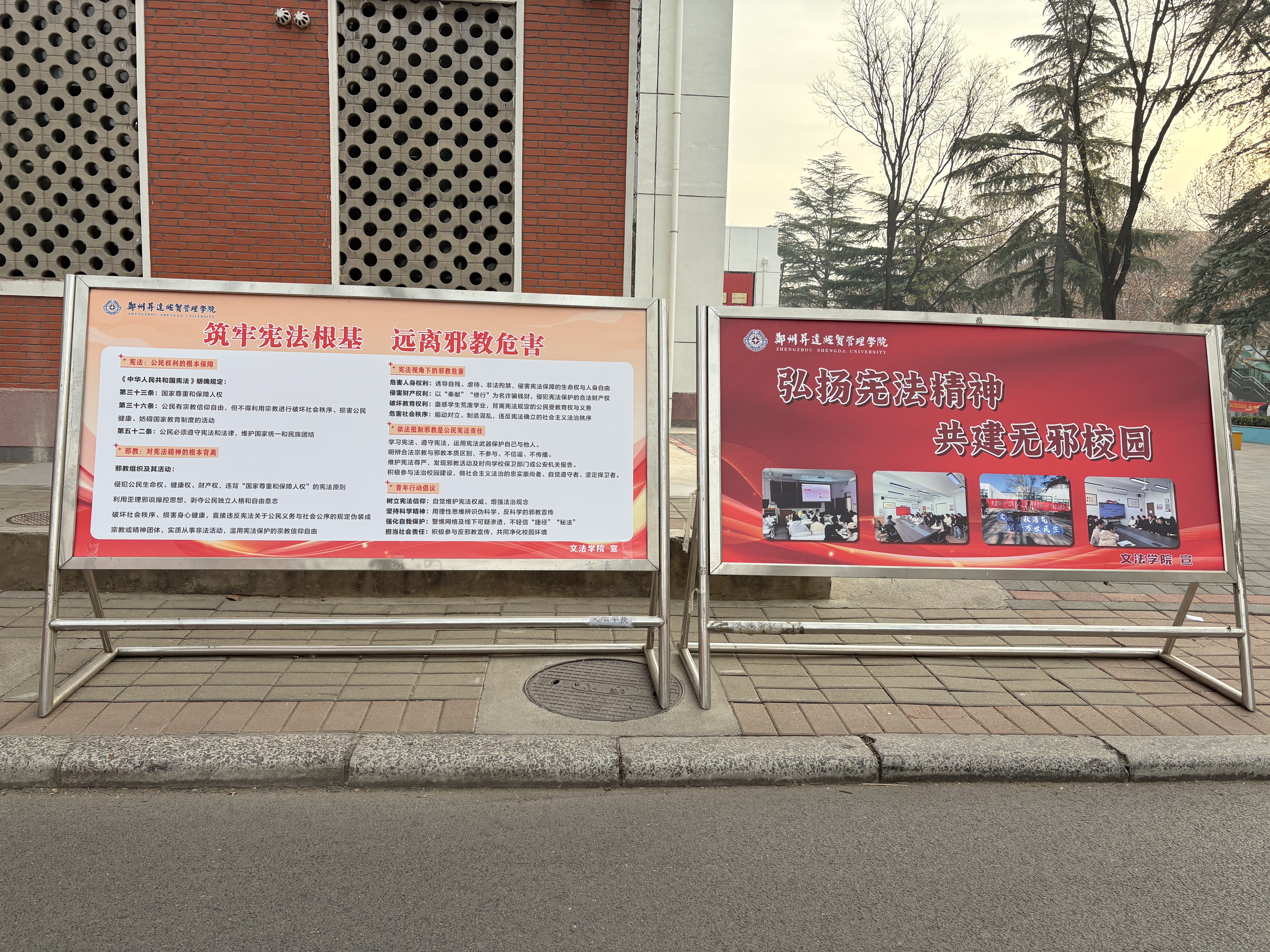 宣传周期间,文法学院构建“线下展示+线上传播”的立体宣传网络。线下,以“宪法引领+反邪警示”为核心陈列展板,用通俗语言解析宪法反邪条款,搭配漫画与真实案例揭露邪教危害,志愿者现场答疑,实现静态展示向动态交流的转化。线上,文法学院制作系列普法反邪短视频,涵盖专业法律解读与邪教渗透警示情景演绎,通过院级公众号推送并发起转发集赞活动,形成全民参与宣传的良好氛围。