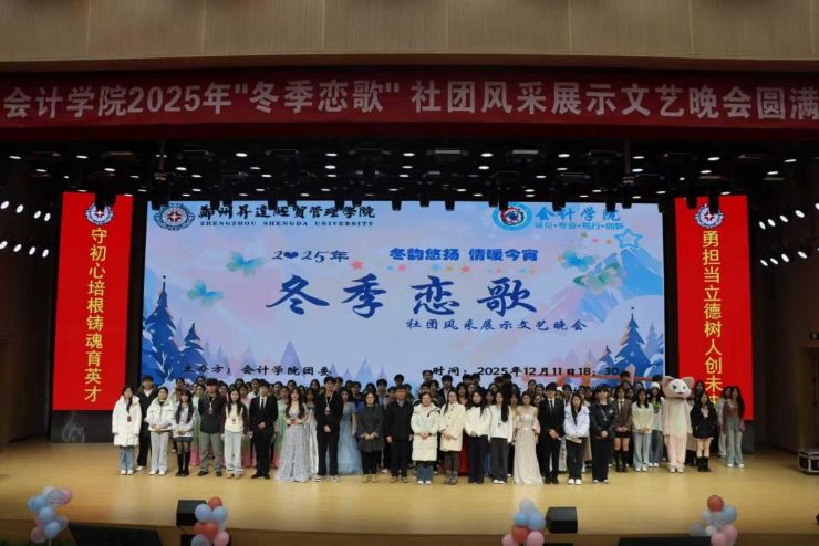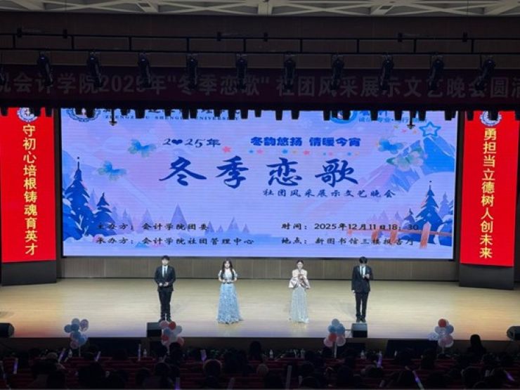 为丰富广大师生的课余文化生活,营造积极向上、多元包容的社团文化氛围。12月11日晚上,由会计学院团委主办、会计学院社团管理中心承办的2025年“冬季恋歌”社团风采展示文艺晚会在新图书馆三楼报告厅隆重举行。会计学院党委书记张蕾、党委副书记兼团委书记陈刚、2025级辅导员兼团委副书记胡淑娟老师、2025级辅导员兼就业工作专员刘爽老师、2025级辅导员兼统战专员姜早阳老师、各兄弟学院团学主要干部和会计学院团学骨干出席晚会现场,会计学院2025级各班学生代表到场观看了本次晚会。