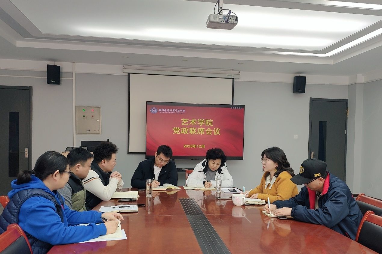 12 月 15 日,艺术学院 2025-2026 学年第六次党政联席会在艺术学院411会议室召开。会议聚焦近期重点工作、教学质量提升、学生服务保障核心议题,明确期末任务清单与下一阶段工作方向,为学院高质量发展凝心聚力。