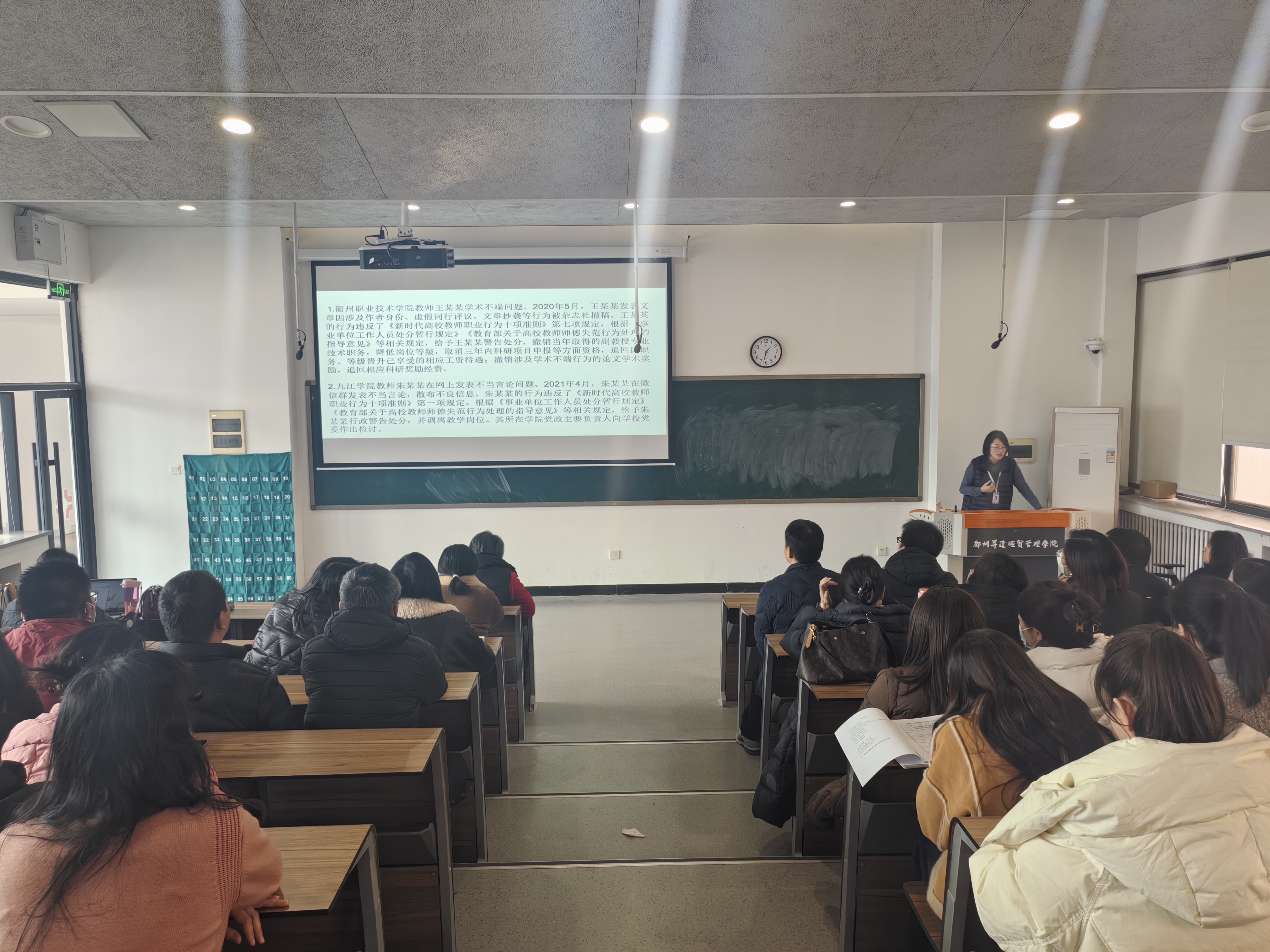在典型案例警示教育环节,张阳通报了近年来教育系统及金融领域发生的师德失范典型案例,重点剖析了学术不端、违规兼职、利益输送等违纪违法事件。通过真实案例的深度解读,揭示了师德失守对学生成长、学院声誉及教育事业的严重危害,为全体教职员敲响了思想警钟。