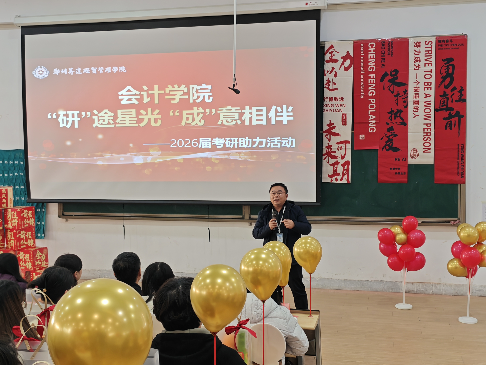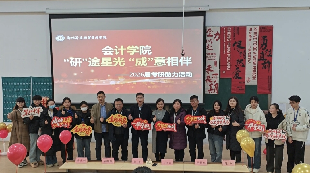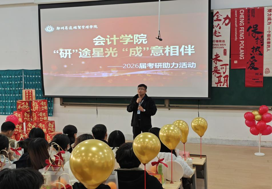 考研冲刺的号角嘹亮吹响,逐梦前行的脚步愈发坚定。为帮助2026届考研学子提振信心、舒缓压力,以最佳状态迎战备考攻坚期,12月8日,会计学院精心举办“研”途星光 “成”意相伴考研助力活动。院长王宝庆、院党委书记张蕾、副院长张新成、副院长毕鹏翾、党委副书记兼团委书记陈刚、教学秘书李永利、学院组织员曹会美及毕业年级辅导员齐聚现场,为即将奔赴考场的学子们送来暖心关怀与殷切嘱托。活动由党委副书记陈刚主持,现场暖意融融,氛围热烈而温情。