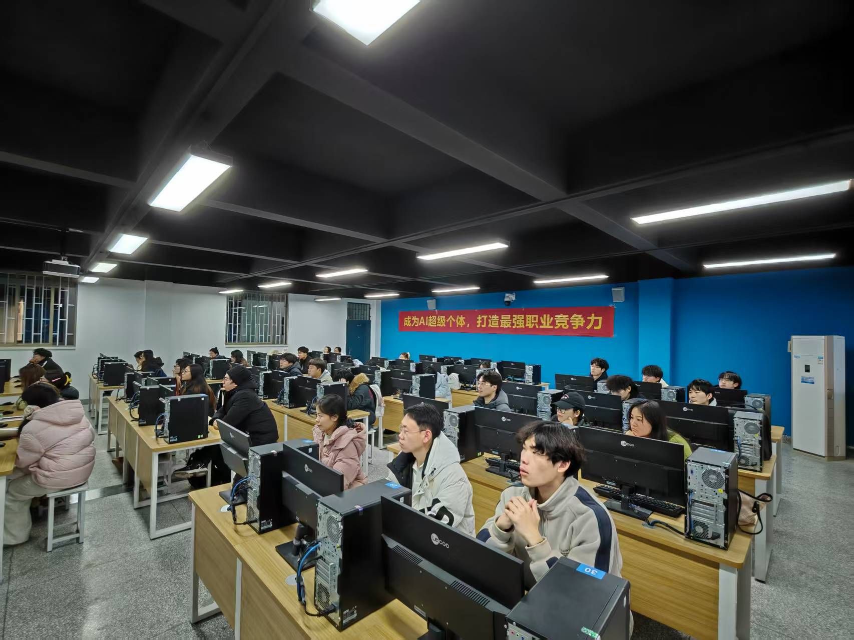 活动中,学生系统学习了剪映、豆包等多款人工智能软件,涵盖视频剪辑、设计排版、数据可视化等功能。培训采用“理论+实操+案例”相结合的教学模式,结合区域产业实际与职场需求,引导学生掌握AI工具的应用逻辑,提升办公与内容创作效率。培训现场学习氛围浓厚,学员积极参与实操,教学互动频繁。