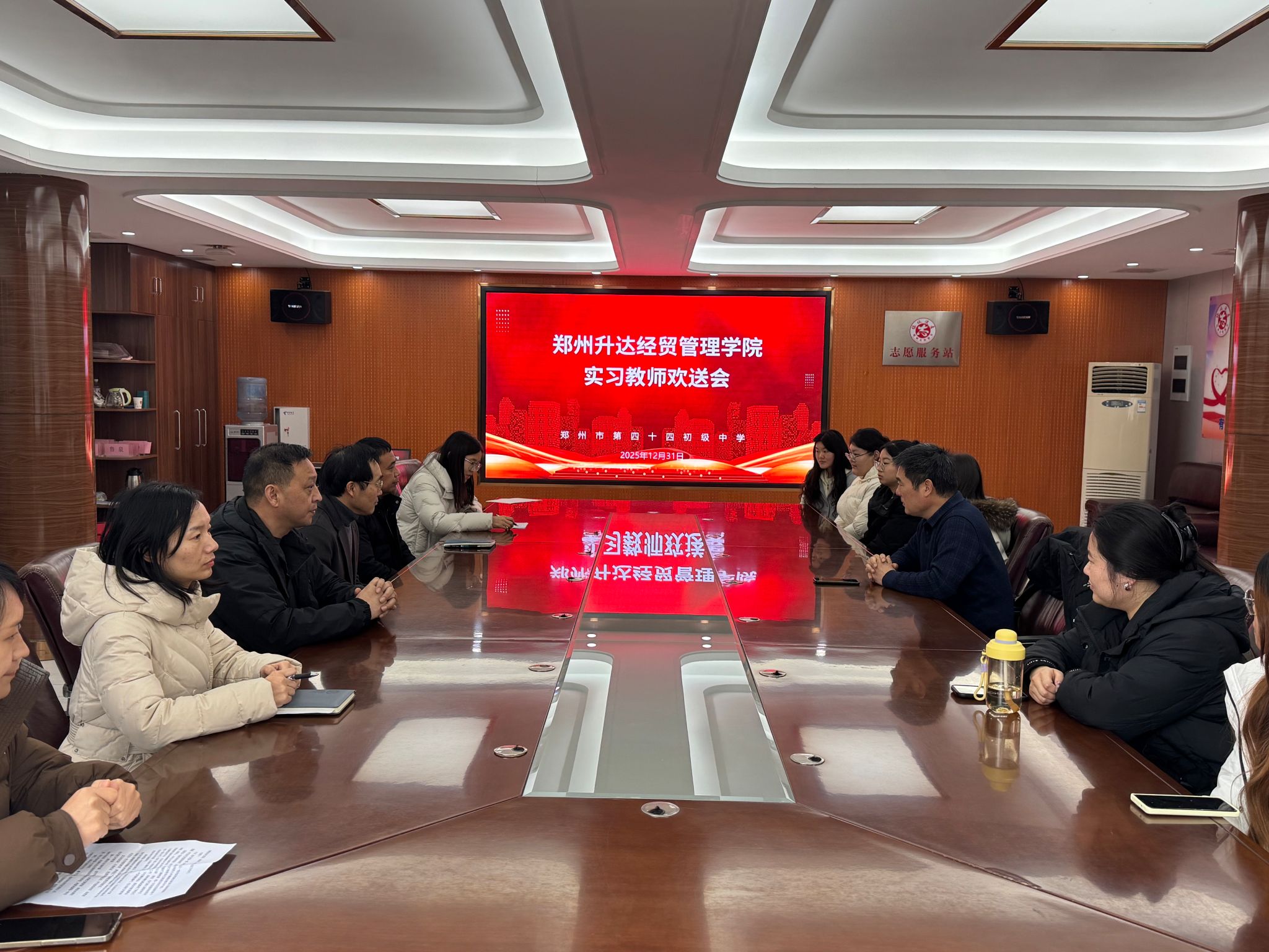 2025年12月31日上午,郑州市第四十四初级中学为我院八名实习学生隆重举办实习欢送会,这标志着为期一段时间的教育实习工作圆满落幕。我院党委书记石皓召、教师陈易萌出席欢送会,与四十四中领导、指导教师代表共同见证实习生的成长与蜕变,共话校际协同育人新篇章。