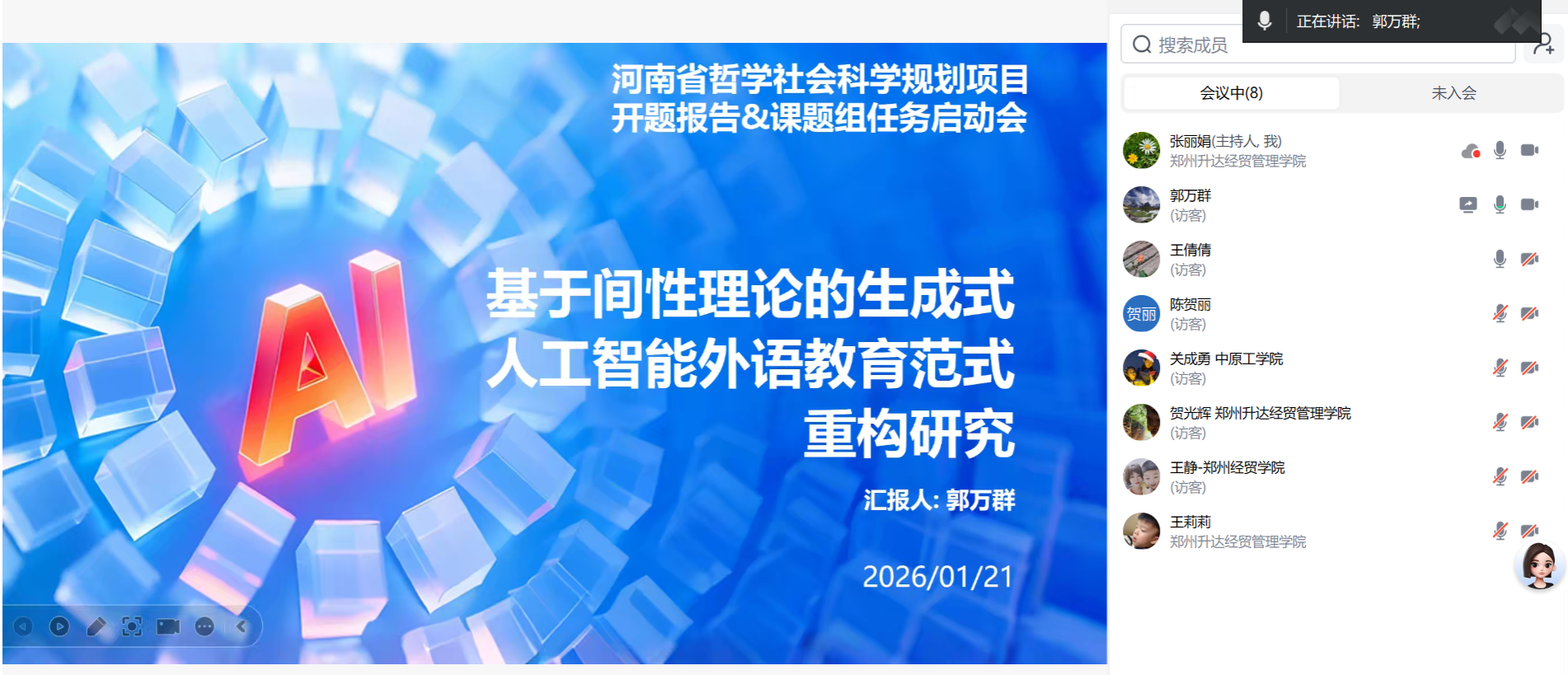 2026年1月21日上午10时,外国语学院河南省哲学社会科学规划项目课题组隆重举行“基于间性理论的生成式人工智能外语教育范式重构研究”开题论证会。开题论证会由课题组成员张丽娟老师主持,王莉莉、贺光辉两位教授受邀莅临现场指导,课题主持人郭万群教授代表课题组作开题汇报,来自华亿体育登录、中原工学院和郑州经贸学院的课题组成员共同参会,就项目研究方案展开深入研讨。