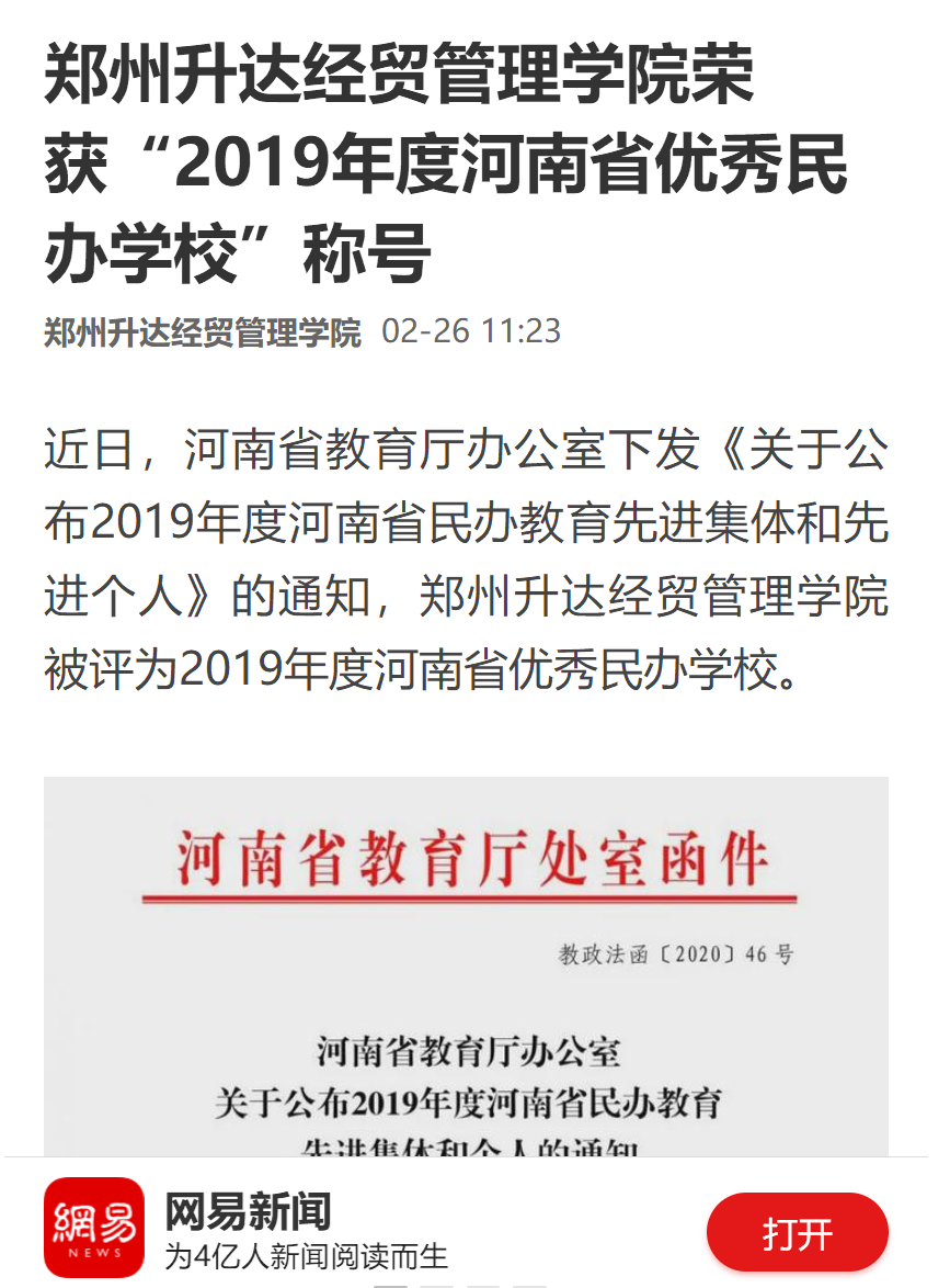 2020年2月26日,网易新闻以《华亿体育登录荣获“2019年度河南省优秀民办学校”称号》为题,报道了我校荣获“2019年度河南省优秀民办学校”称号、王新奇荣获“2019年度河南省民办教育先进个人”称号的喜讯。现将原文摘录如下: