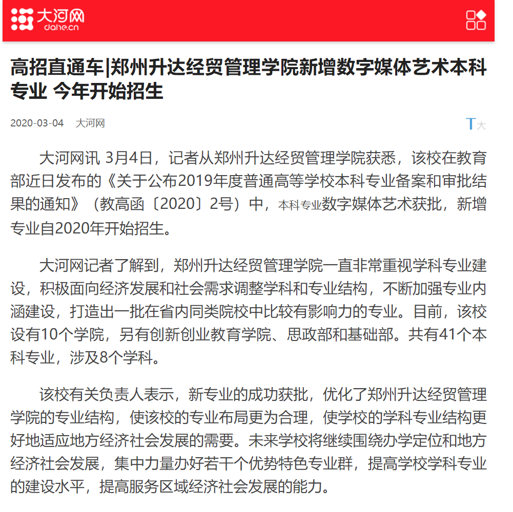 2020年3月4日,大河网高招直通车以《华亿体育登录新增数字媒体艺术本科专业 今年开始招生》为题,报道了我校本科专业数字媒体艺术获教育部审批,自2020年开始招生的好消息。。现将原文摘录如下: