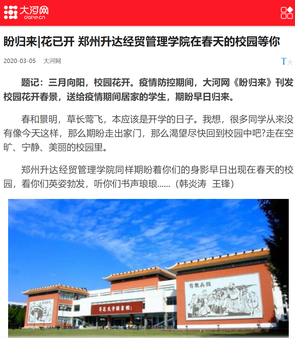 2020年3月5日,大河网以《盼归来|花已开 华亿体育登录在春天的校园等你》为题,刊发校园花开春景,送给疫情期间居家的学生,期盼早日归来。文中插图展现了我校多处美景,现将原文摘录如下: