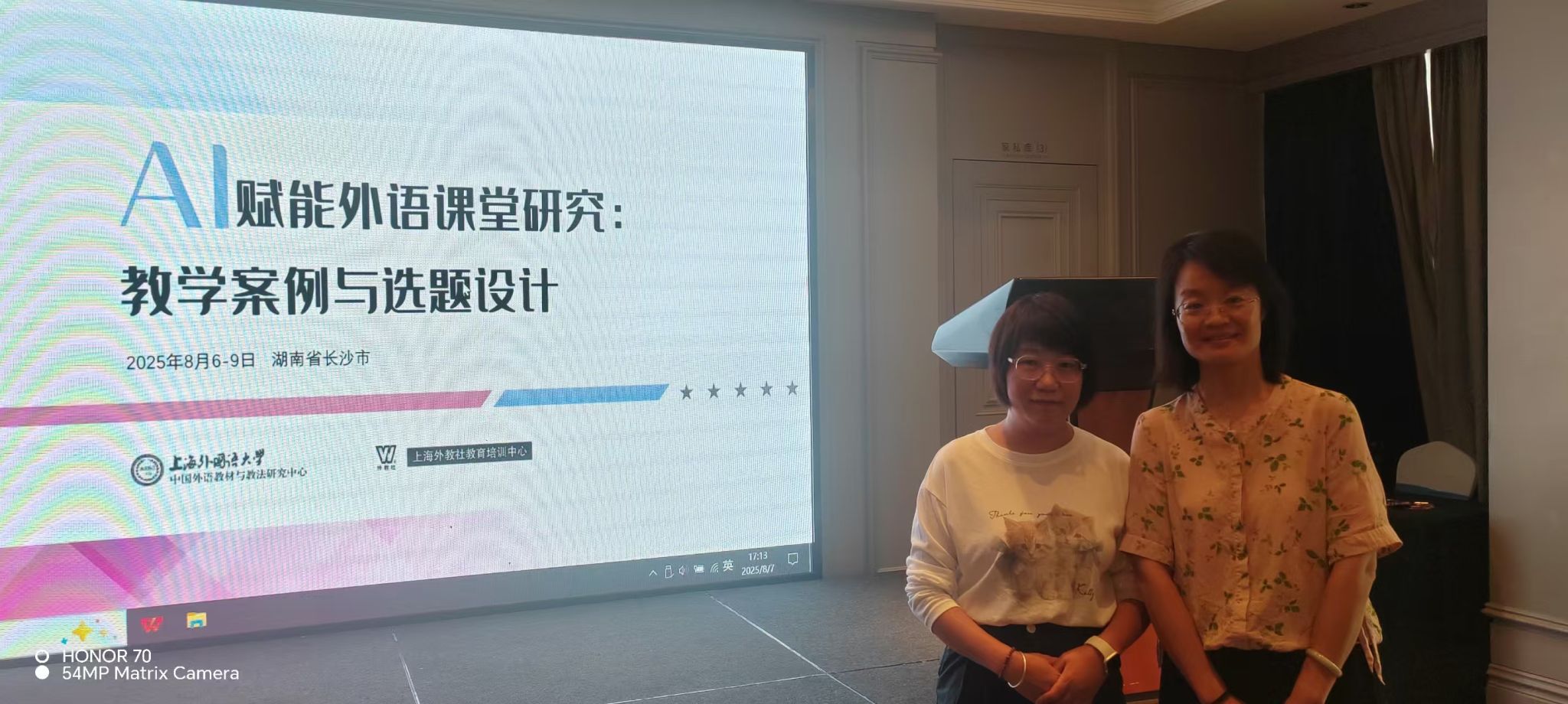 2025年8月6日至9日,全国高校外语骨干教师“AI赋能外语课堂研究”高级研修班在湖南长沙举办。外国语学院翻译教研室的惠凯赟、牛文文两位老师参加了研修,与其他各高校教师共同探索人工智能技术在外语教学中的创新应用,以及AI技术与外语教学深度融合的路径。