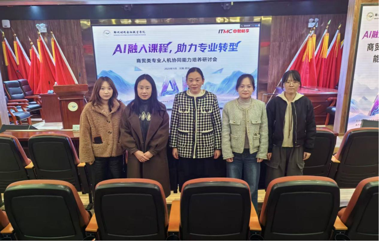 为推动“人工智能+教育”深度融入教学全流程,全方位赋能专业人才培养,11月8—9日商学院教师常春燕、苗贞贞、崔冰彤、梁言、卢瑞娜五名教师参加由河南省电子商务职业教育集团、深圳市跨境电子商务协会主办,郑州财税金融职业学院数字商贸学院承办、中教畅享科技股份有限公司协办的河南省商贸类专业人机协同能力培养研讨会。