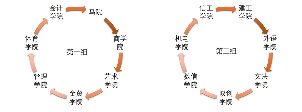 学院互查分组详见下图,以推磨式开展循环互查,例如“马院检查商学院,商学院检查艺术学院”。