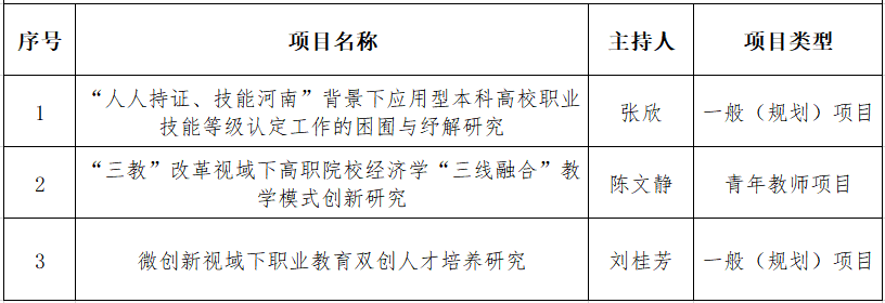 根据《河南省教育厅办公室关于开展2022年河南省职业教育教学改革研究与实践项目立项工作的通知》(教职成函〔2022〕682号)文件精神,我校组织了2022年度河南省职业教育教学改革研究与实践项目申报遴选工作,经各学院申报,专家组评审,拟推荐《“人人持证、技能河南”背景下应用型本科高校职业技能等级认定工作的困囿与纾解研究》等3个项目申报2022年河南省职业教育教学改革研究与实践项目,现予以公示,排名不分先后,具体见下表: