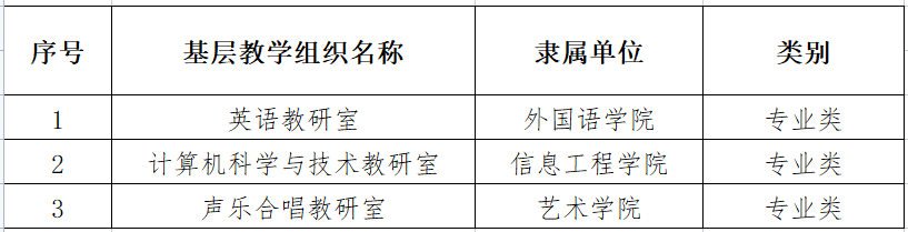 根据《郑州市教育局办公室关于郑州地方高校优秀基层教学组织2020年度结项和2022年度立项工作的通知》(郑教高函〔2022〕683号)文件精神,我校组织了2022年度市级优秀基层教学组织申报遴选工作,经各学院教研室申报,专家组评审,拟推荐外语学院英语教研室等3个基层教学组织申报2022年郑州地方高校优秀基层教学组织项目,现予以公示,排名不分先后,具体见下表: