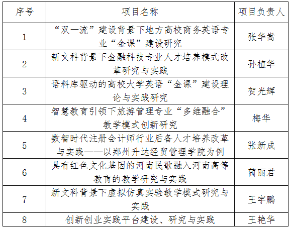 根据《郑州市教育局办公室关于开展郑州地方高校教学改革研究与实践项目第九批结项和第十批立项工作的通知》(郑教高函〔2022〕673号)文件精神,我校组织了2022年度市级教学改革研究与实践项目申报遴选工作,经各学院申报,专家组评审,拟推荐《“双一流”建设背景下地方高校商务英语专业“金课”建设研究》等8个项目申报2022年郑州地方高校教学改革研究与实践项目,现予以公示,排名不分先后,具体见下表: