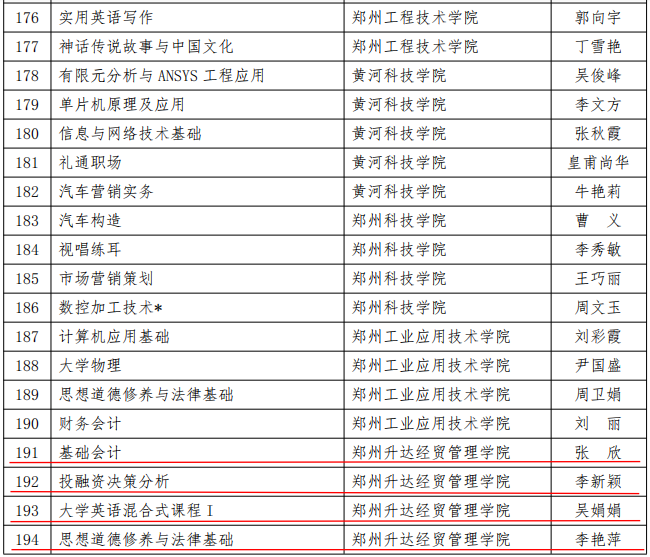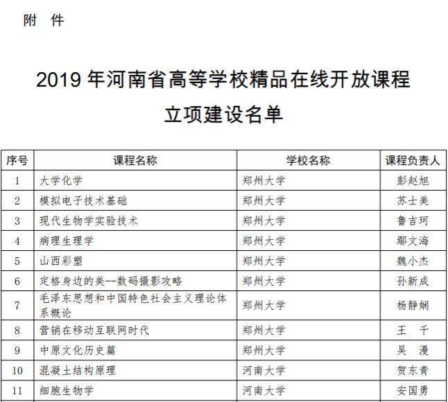 按照河南省教育厅办公室《关于做好2019年河南省高等学校精品在线开放课程建设工作的通知》(教办高〔2019〕377号)要求,经学校评审择优推荐申报,专家评审委员会评审,根据《河南省教育厅关于公布2019年河南省高等学校精品在线开放课程立项建设名单的通知》,我校4门课程获批立项建设:会计学院《基础会计》、金融贸易学院《投融资决策分析》、基础部《大学英语混合式课程 I》、马克思主义学院《思想道德修养与法律基础》。