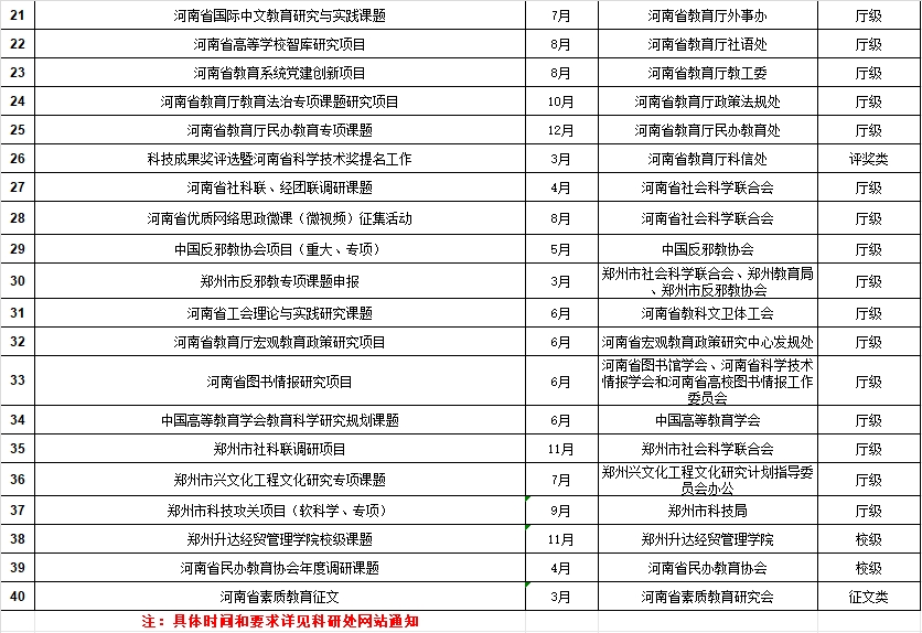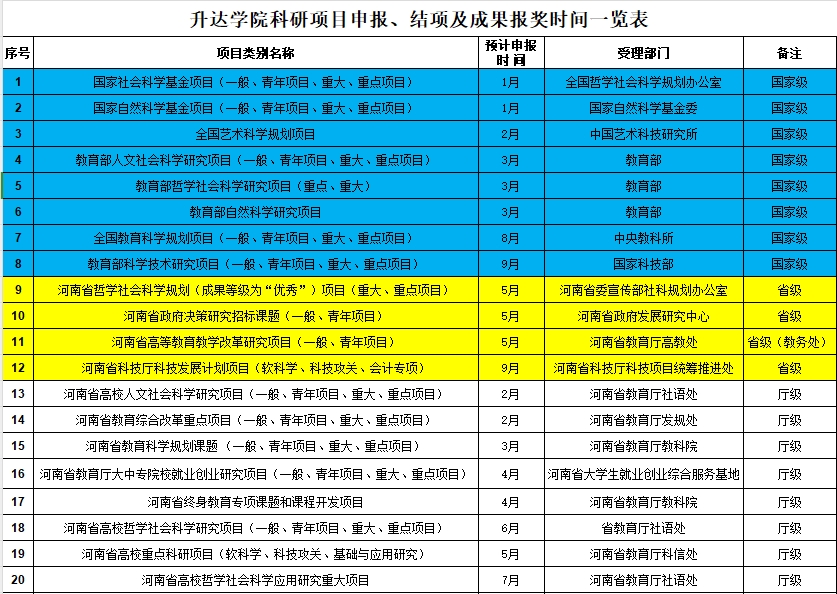 近年来,学校以习近平新时代中国特色社会主义思想为指导,深入贯彻落实党的二十大精神和2024年全国、全省教育工作会议精神,坚守立德树人的初心与使命,全面深化教育教学改革,创新人才培养模式,为了推动科技创新与学术研究的持续发展,确保各类科研项目申报工作的有序进行,现将近期及未来一段时间内科研项目申报的时间进度安排公告如下,请大家密切关注并提前做好相关准备。