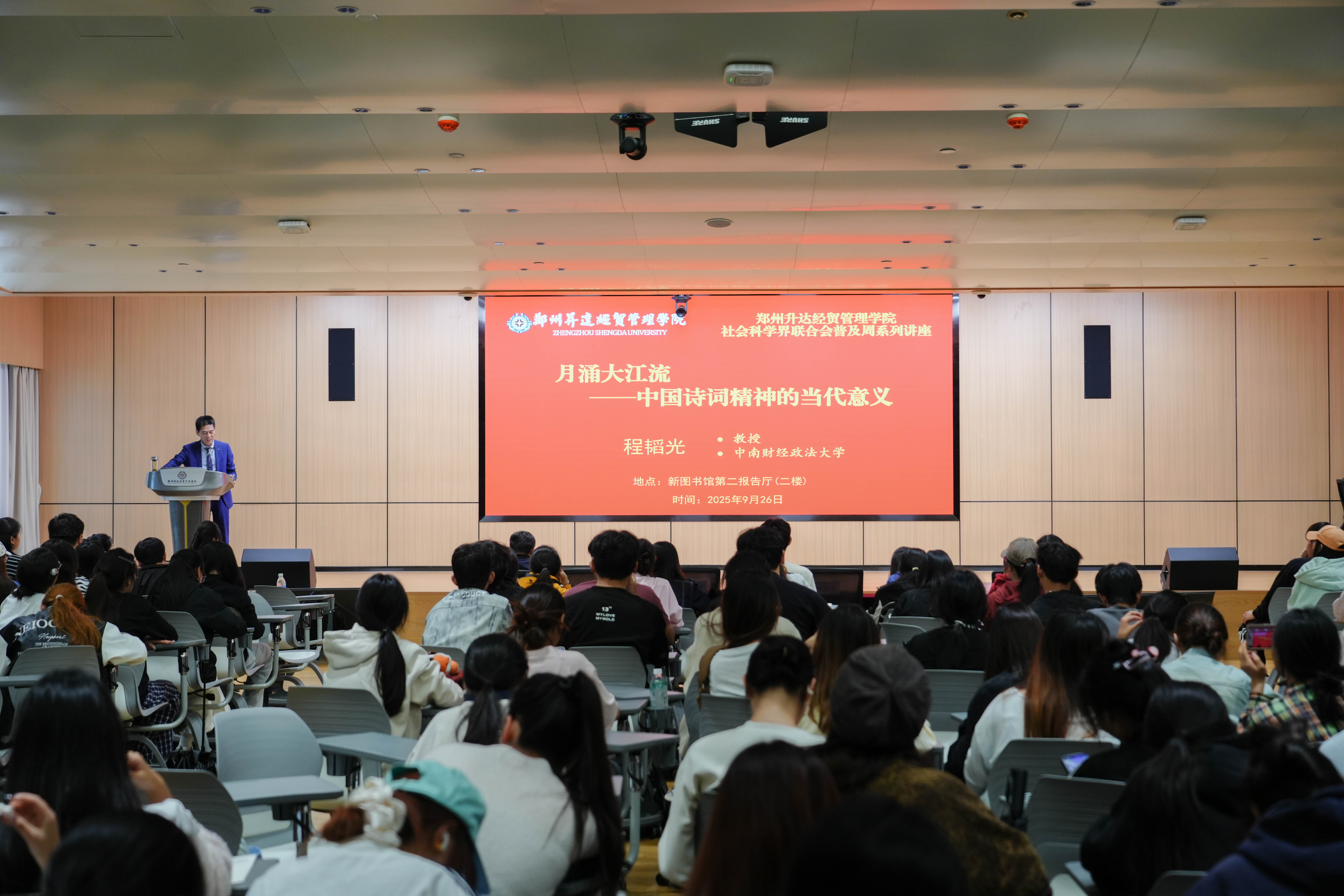 启动仪式后,首场社科普及专题报告由程韬光教授主讲。他以《中华诗词精神的当代意义》为题,深入浅出地阐释了中华诗词的深厚精神内涵及其在当代社会的重要价值。程教授引经据典,结合生动实例,为在场师生带来了一场启迪思想的文化盛宴,进一步激发了大家传承与弘扬中华优秀传统文化的热情与使命感。