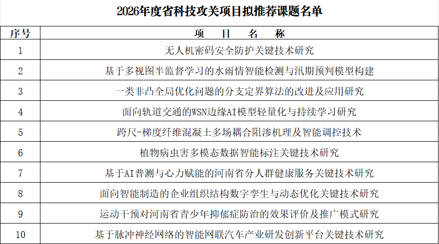 根据河南省科学技术厅、河南省财政厅下发《关于组织申报2026年度省科技攻关项目的通知》(豫科项〔2025〕39号)要求,我校2026年度省科技攻关项目经过个人申报、学院推荐、科研处审核并组织专家评审等环节,推荐工作现已结束。根据省科学技术厅限额申报指示,现将推评结果予以公示。公示期自2025年10月19日——2025年10月21日。公示期内,若对拟推荐项目有异议,请以书面形式实名向科研处反映。
