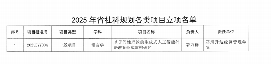 接河南省哲学社会科学工作事务中心通知,2025年河南省哲学社会科学规划项目评选结果公布,我校获批一般项目1项。