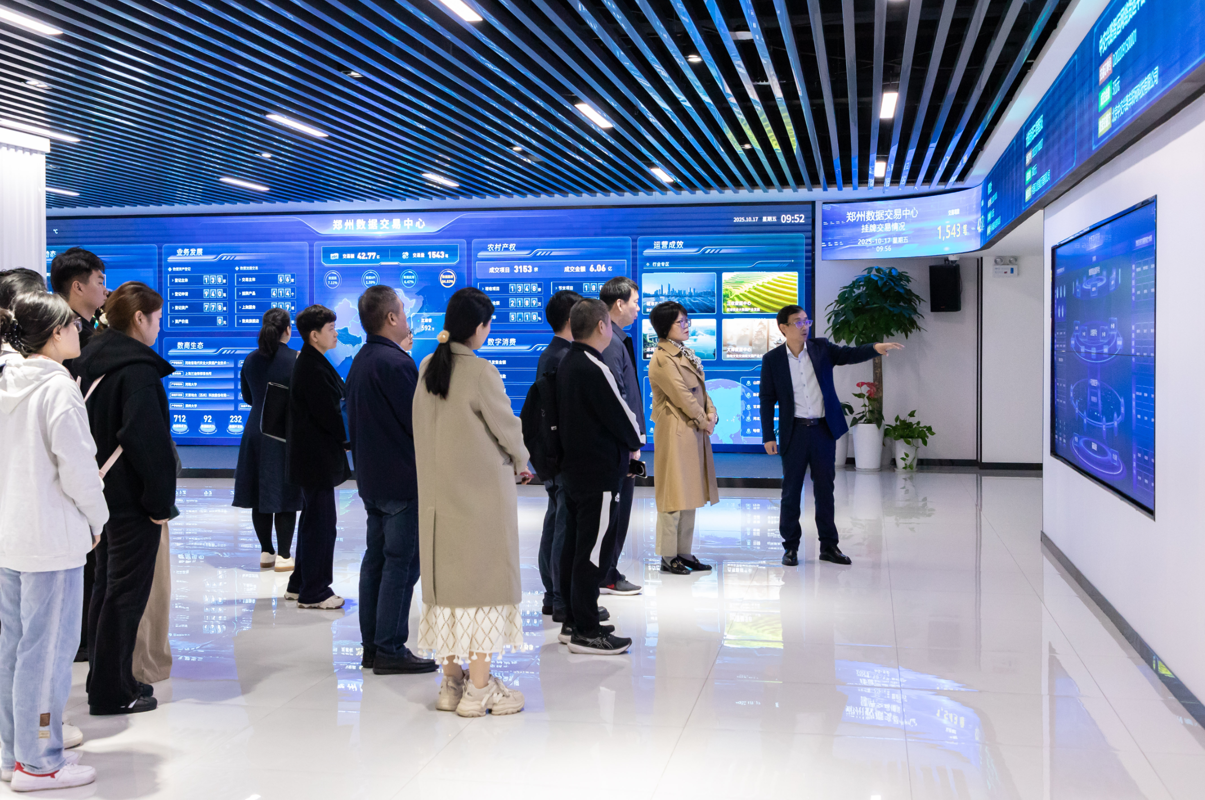 上午9:30,参访团队到达郑州数据交易中心。首先,在潘新民总经理的陪同下,张欣校长一行参观了郑州数据交易中心展厅。在展厅中,大家通过丰富的展示内容和先进的展示手段,深入了解了数据交易的前沿技术和行业动态,对数据在现代经济中的重要作用有了更为直观和深刻的认识。