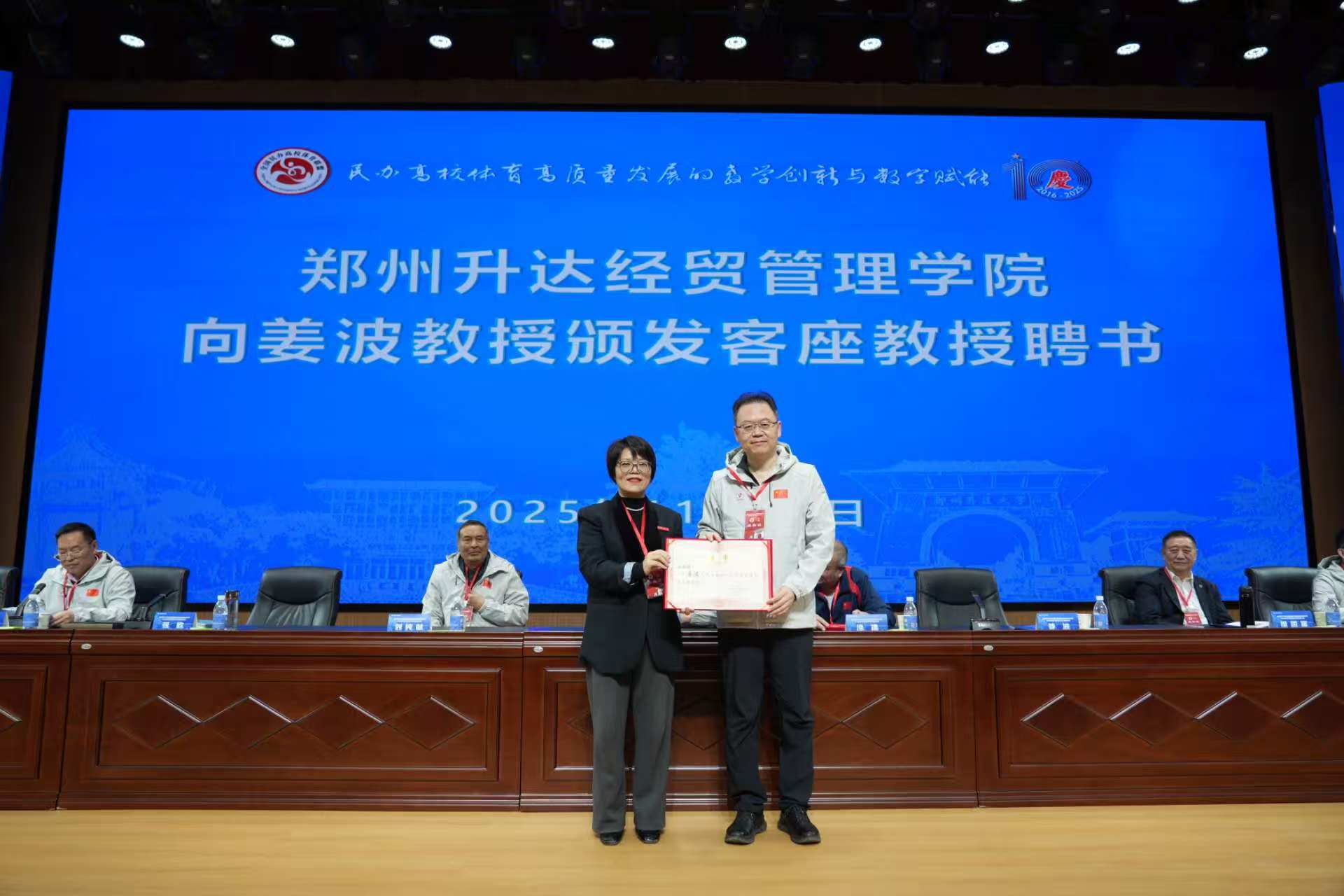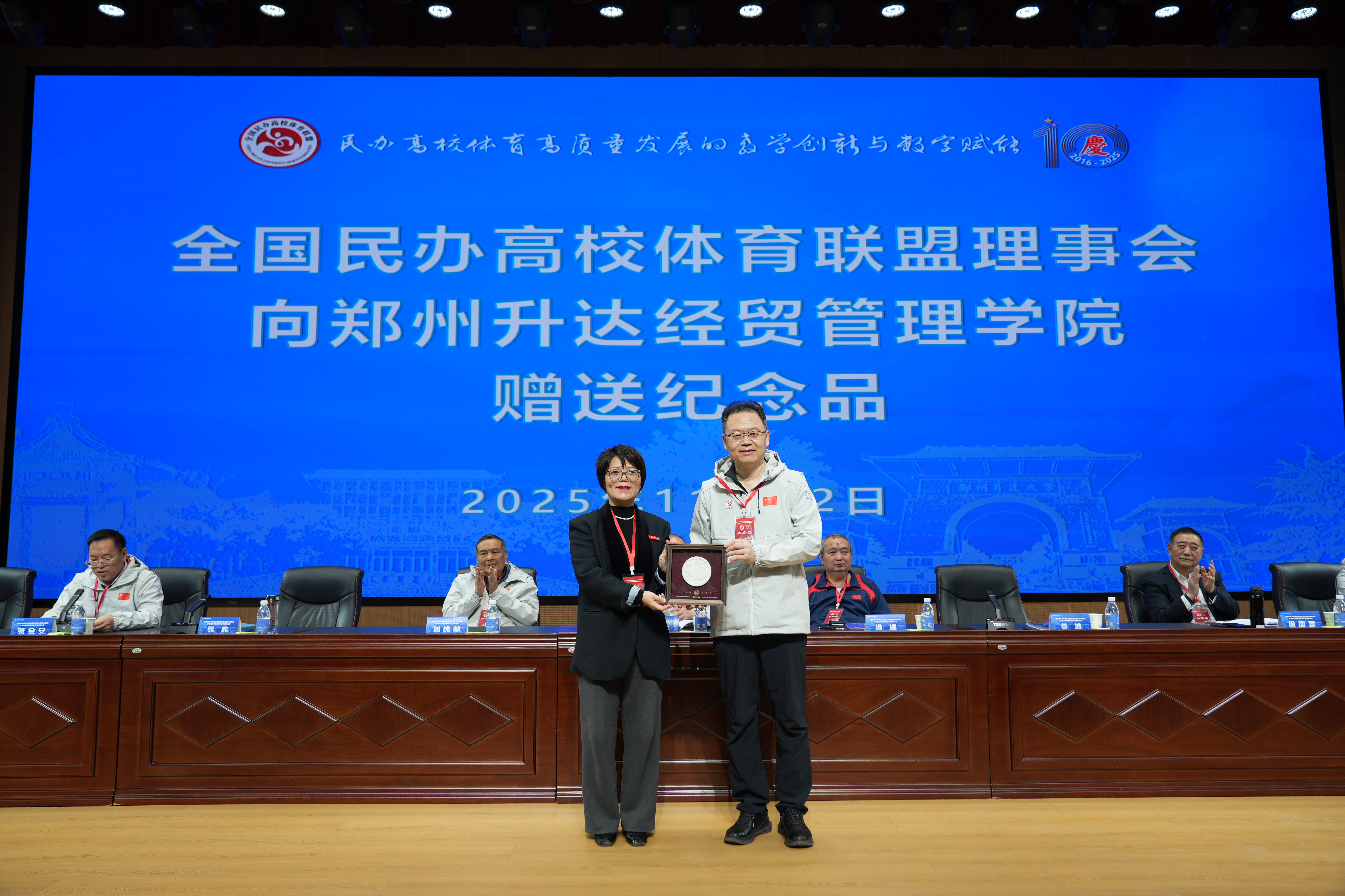 张欣、姜波分别代表升达和全国民办高校体育联盟理事会互赠纪念品。张欣代表学校向莅会的嘉宾池建、姜波、刘纯献、徐国富颁发客座教授聘书。
