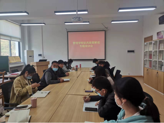 进一步提高毕业生就业率,扩大征兵工作宣传覆盖面,鼓励有理想、有抱负、有知识的青年学生积极响应党和政府的号召应征入伍。2022年3月29日管理学院召开征兵政策解读专题培训会,管理学院邀请就业处张志顺老师给全体辅导员老师讲解征兵政策。会议由许广庆老师主持,全体辅导员老师参会。