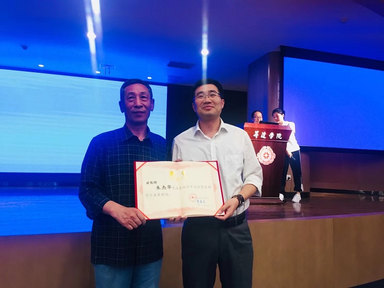 讲座结束后,纪德尚院长为朱杰华经理颁发客座教授聘书并做总结讲话,对朱经理的讲座表示感谢。纪院长还讲到,讲座为大三学生上了一堂职业规划课,理论与实践结合,既有高度又接地气,同时鼓励到场学生,认真学习,积极对待毕业与就业。