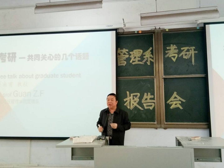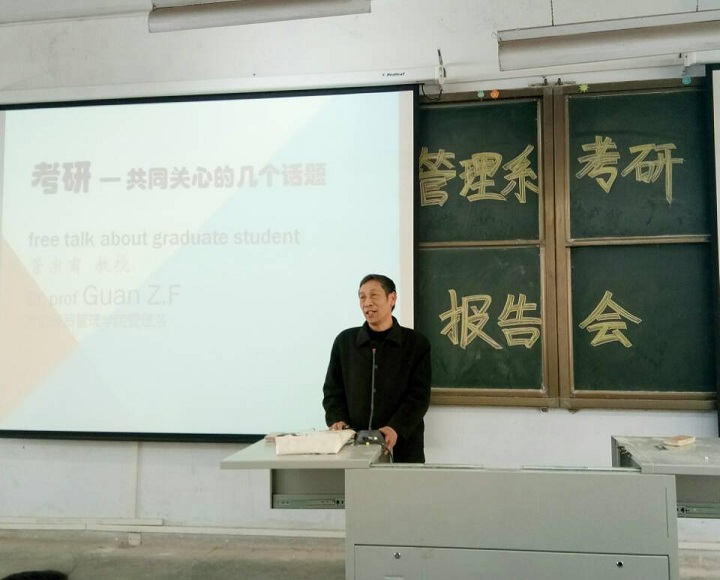 会议开始,管理系系主任纪德尚教授代表在场全体人员对于管宗甫教授到来表示热烈欢迎,并且为大家分析了近年的考研趋势,为准备考研的学生怎样抓住这次机会提出了自己的见解。