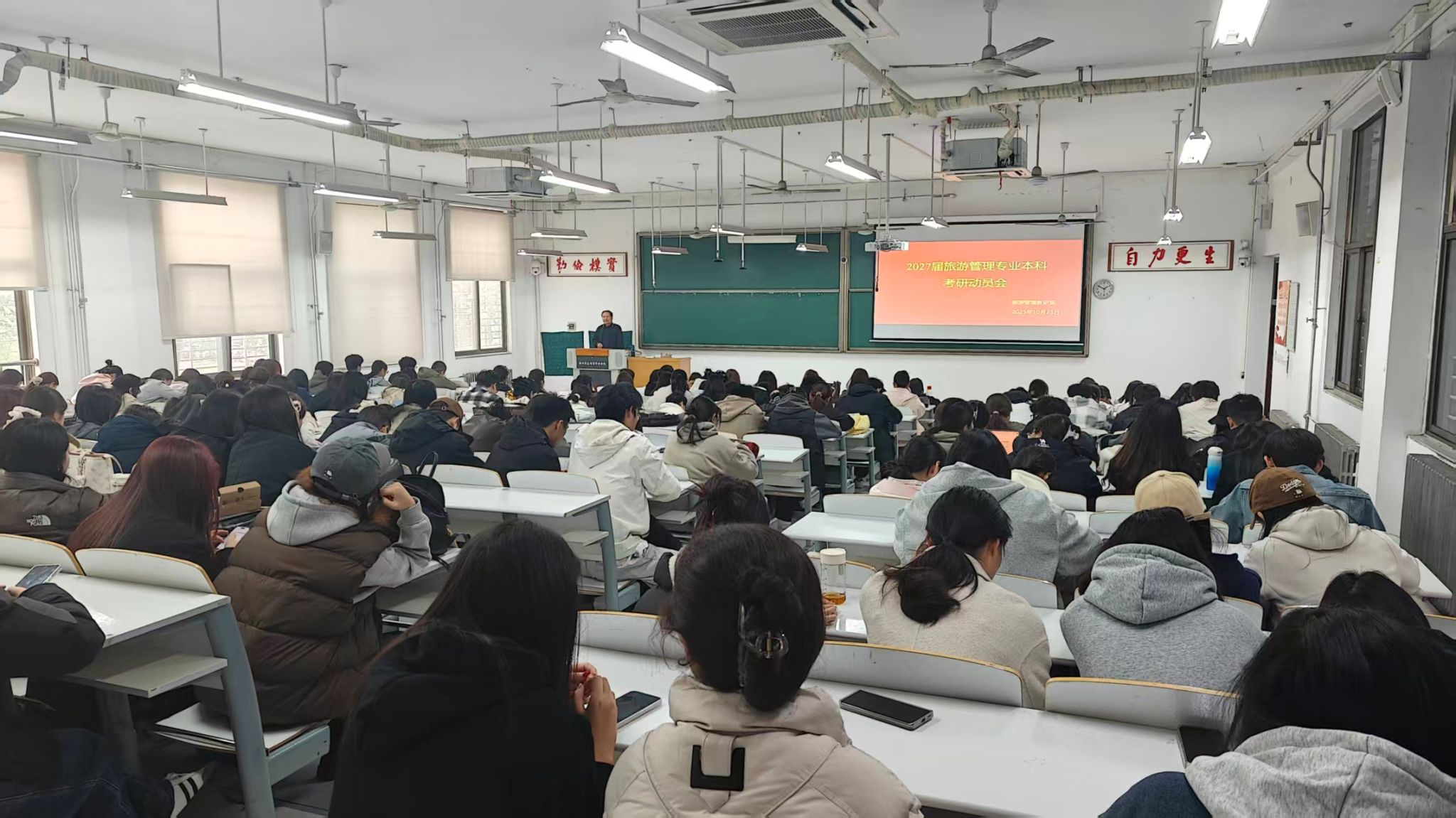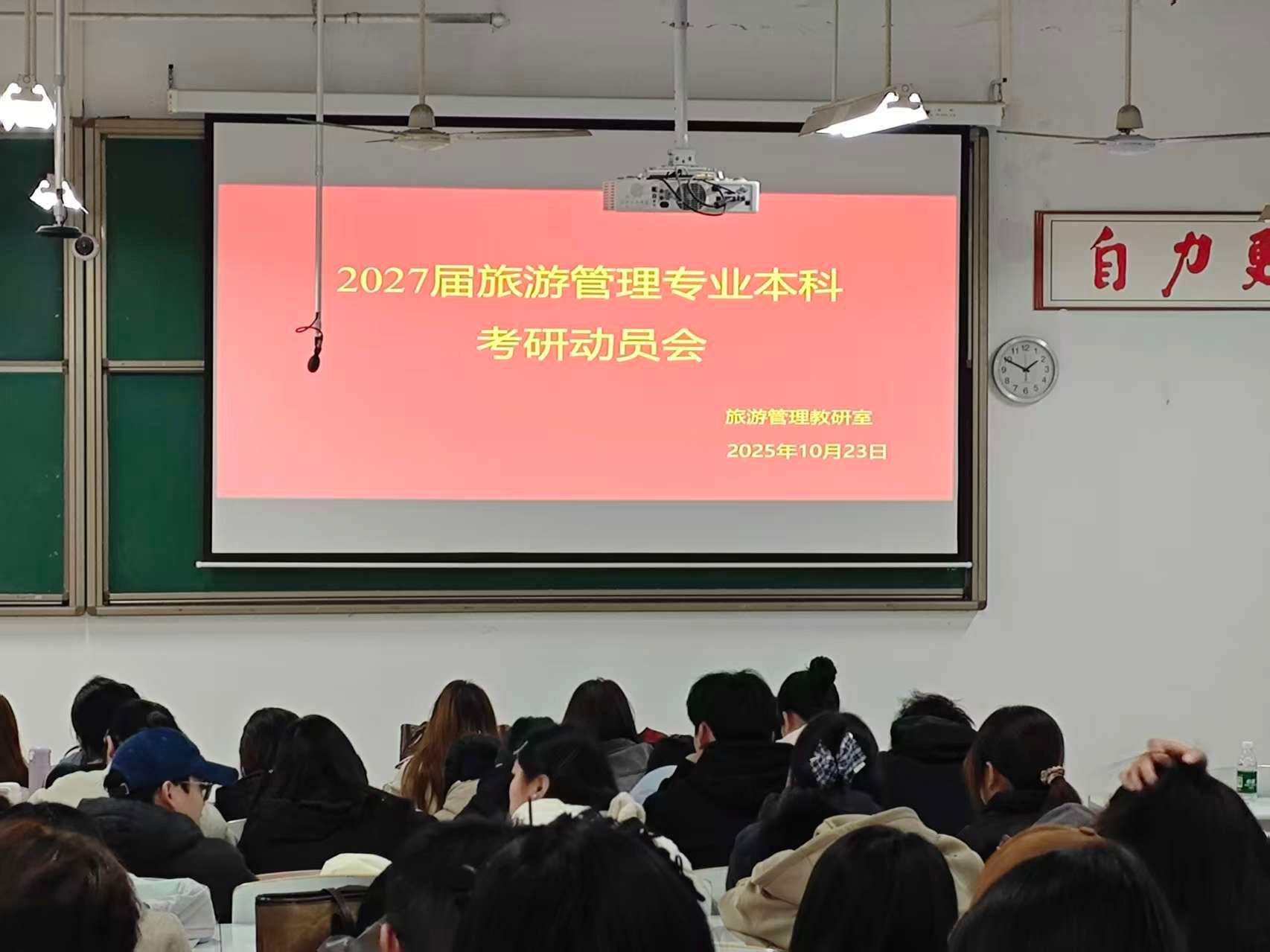 为帮助2027届旅游管理专业本科学生明晰考研方向,科学规划备考路径,激发升学深造热情,旅游管理教研室于2025年10月23日下午在时金楼-108教室组织召开了面向2027届学生的考研动员大会。本次动员会由孙海娜老师主持,并邀请赵文亮教授担任主讲嘉宾。