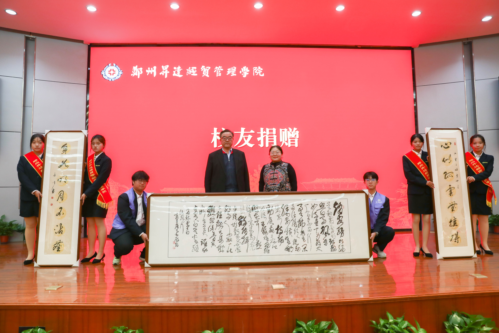 校友捐赠环节,管理学院校友会顾问李响向母校捐赠书法作品三幅,秘书长张书会赞助此次大会全部文创袋。学校董事长向捐赠校友颁发感谢状以示感谢。李响校友因公未能出席,特委托管理学院校友会副会长吴广营出席捐赠和接受感谢状。