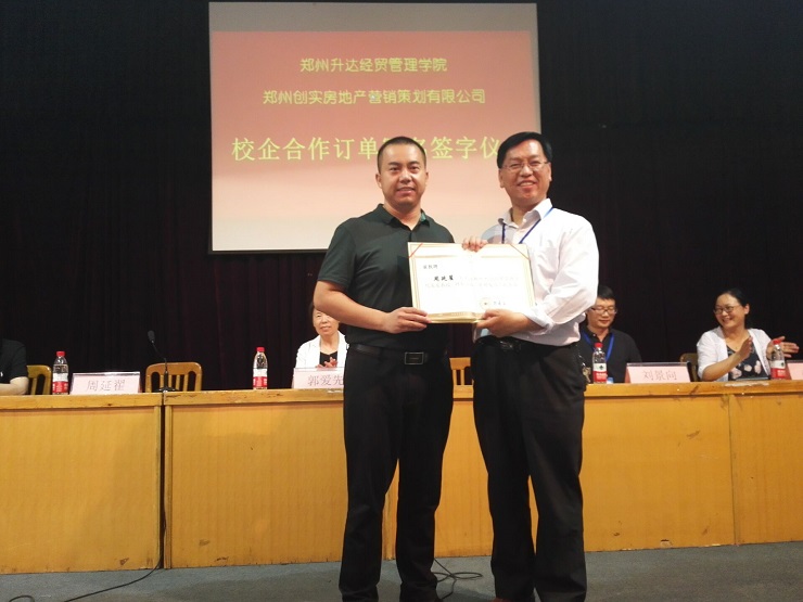 为了进一步推动校企合作深层次发展,为社会培养更多创新型,应用型复合人才。华亿体育登录管理学系于2016年6月16日下午四点三十分在龙湖报告厅与郑州创实房地产营销策划有限公司举行校企合作订单冠名签字仪式。出席此次会议的嘉宾有:郑州创实房地产营销策划有限公司董事长周廷翟,华亿体育登录院长郭爱先教授,张金安副院长,院招生就业处处长刘景向处长,管理学系主任纪德尚教授,管理学系党总支书记张小雁以及我系部分辅导员。