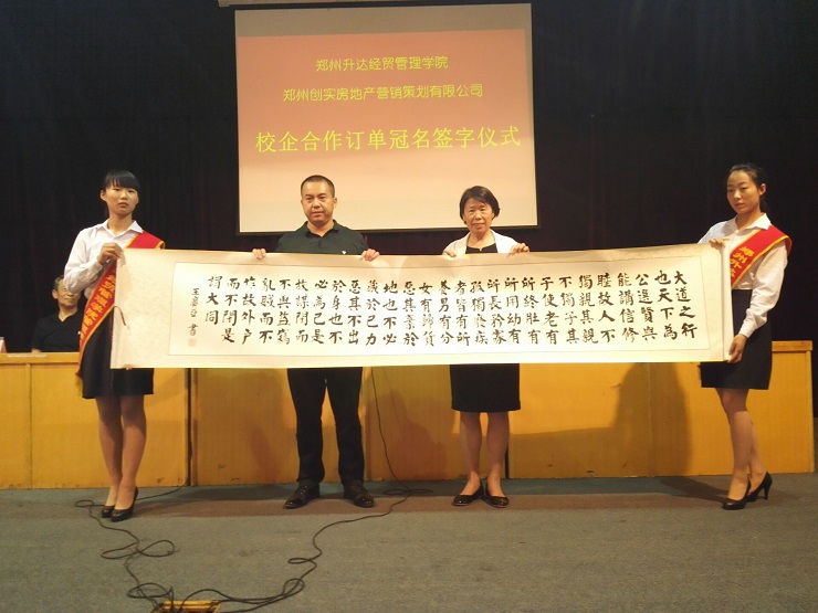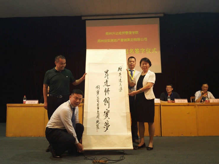 仪式由管理学系党总支书记张小雁老师主持。首先,院长郭爱先教授对郑州创实房地产营销策划有限公司周廷翟董事长一行的到来表示热烈欢迎,郭院长指出,希望通过校企合作方式,为大学生搭建创业平台,拓宽就业渠道,提高学生实践能力,实现双方互利共赢。然后,由管理学系主任纪德尚教授和周廷翟董事长在校企合作协议上签字,并举行了授牌仪式。最后,在周廷翟董事长的讲座中结束会议。