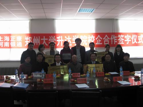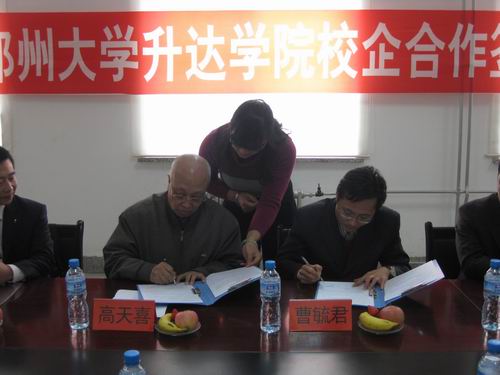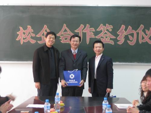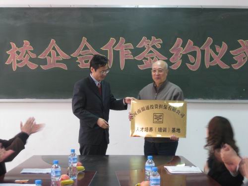 随后,高天喜主任分别与段燚董事长、曹毓君总经理在合作协议上签字。段燚董事长、曹毓君总经理分别代表上海正康仪器有限公司、河南银通投资担保公司向企业管理系颁发了“河南正康仪器有限公司人才培训基地”和“河南银通担保有限公司人才培训基地”牌匾;高天喜主任分别向两个公司颁发了“郑州大学升达学院就业实习基地”牌匾,正式和我院建立了校企合作关系,我院就业处李长录处长也向企业方赠送了介绍创办人的书籍。