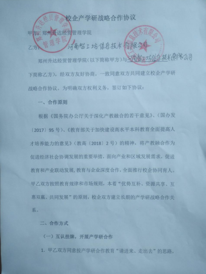 双方互认挂牌,开展产学研合作。按照“引进来、走出去”的思路围绕人才培养等内容进行合作。并成立“豫企人力资源开发研究中心”,并互派人员共建共管。双方协同育人方面进一步深化产教融合。学院聘请河南智工坊领导担任我校教授和专业导师参与各专业人才培养方案修订。双方在硬件设施建设方面进行更加友好合作。河南智工坊在校外建立实习和就业基地,管理学院每年可以选派毕业生到河南智工坊就业。