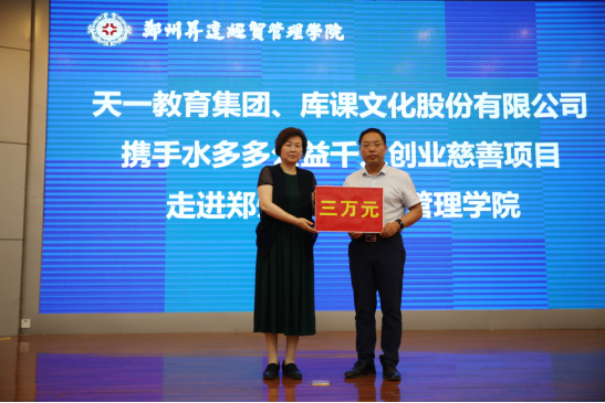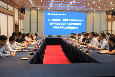 2019年5月23日,天一教育集团、河南库课文化股份有限公司携手水多多公益千人创业慈善项目走进华亿体育登录,活动于当日上午9:30在升达学院行政大楼国际会议厅隆重举行。出席本次活动的主要嘉宾有郑州慈善总会副会长王合生,郑州慈善总会副秘书长桑喧越,天一教育集团、河南库课文化传播有限公司董事长董国良,水多多创始人黄天一,郑州市大学生创业就业慈善基金负责人樊延峰。