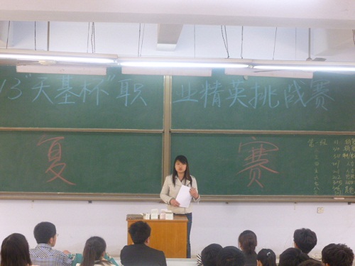 2013年4月19日下午2:30在二号教学楼成功举办了“天基杯”复赛。本次比赛的嘉宾有国美电器人力资源经理李巍先生、可口可乐人力资源经理李继红女士、天基人才网产品总监黄昭女士天基人才网、人力资源总监马妮娅女士、中高级人才运营经理邢韬女士、沃尔玛城市人力资源经理贾巧歌女士、沃尔玛、助理人力资源经理张婧婧、大商集团人力资源总监王守铎先生、招聘培训课课长张华先生、华丽灯饰人力资源总监郑娟女士、林国荣创意科技大学项目总监马丁先生。